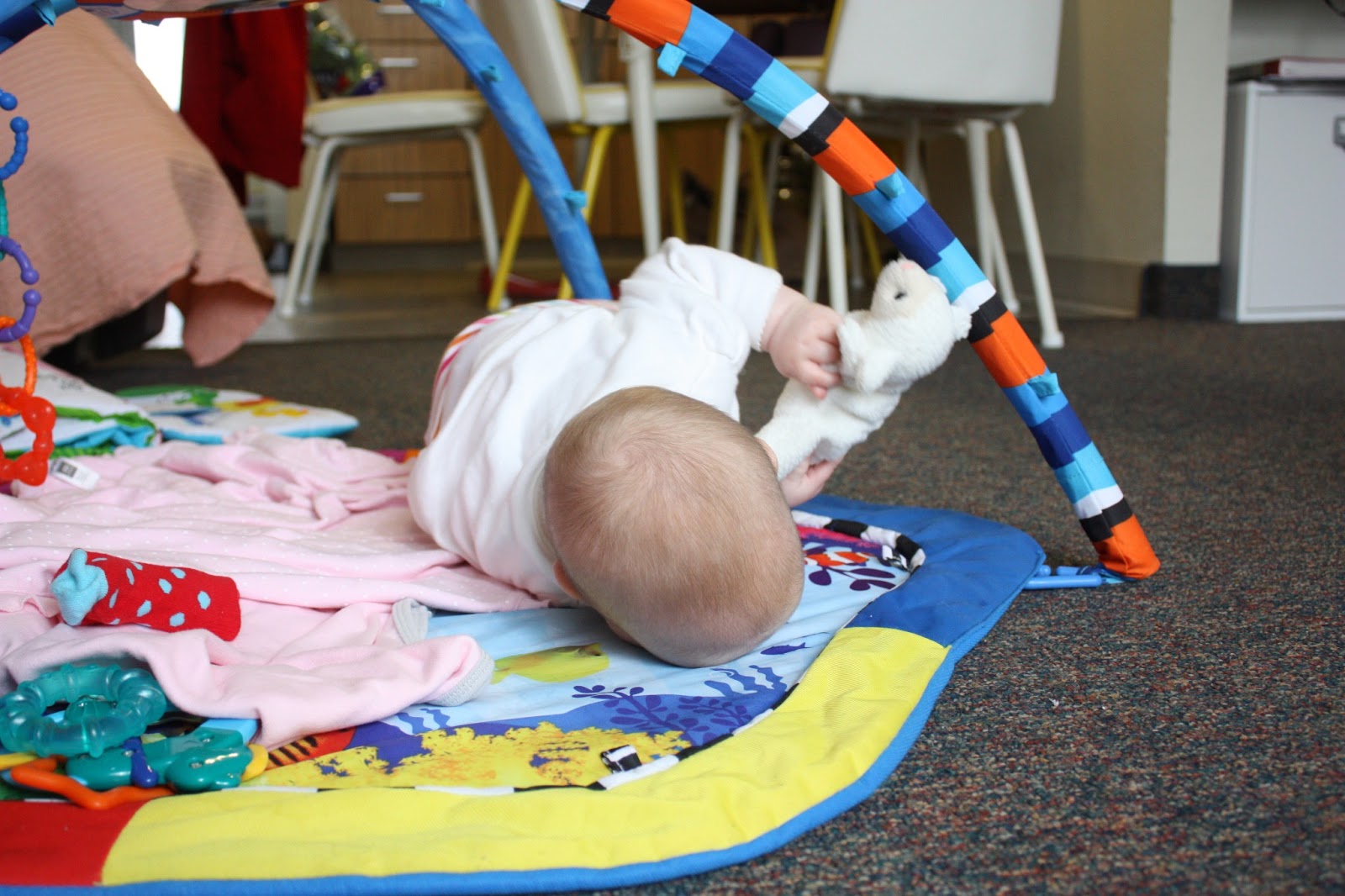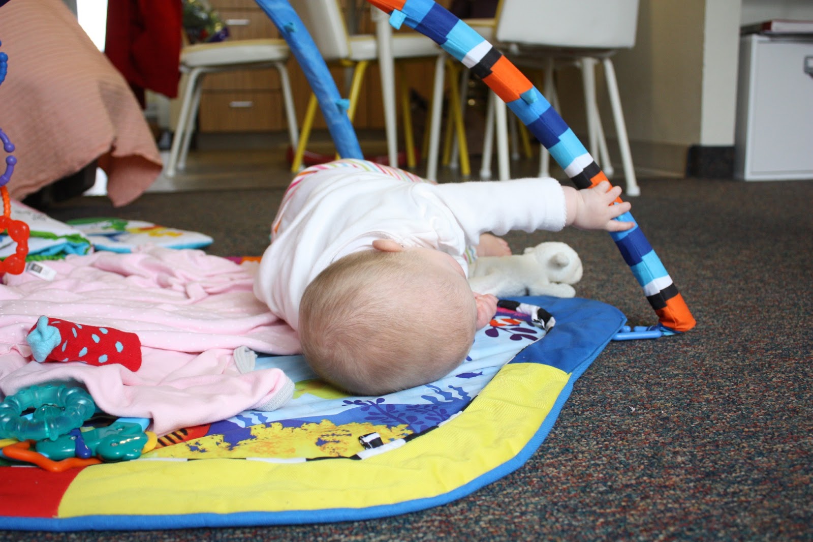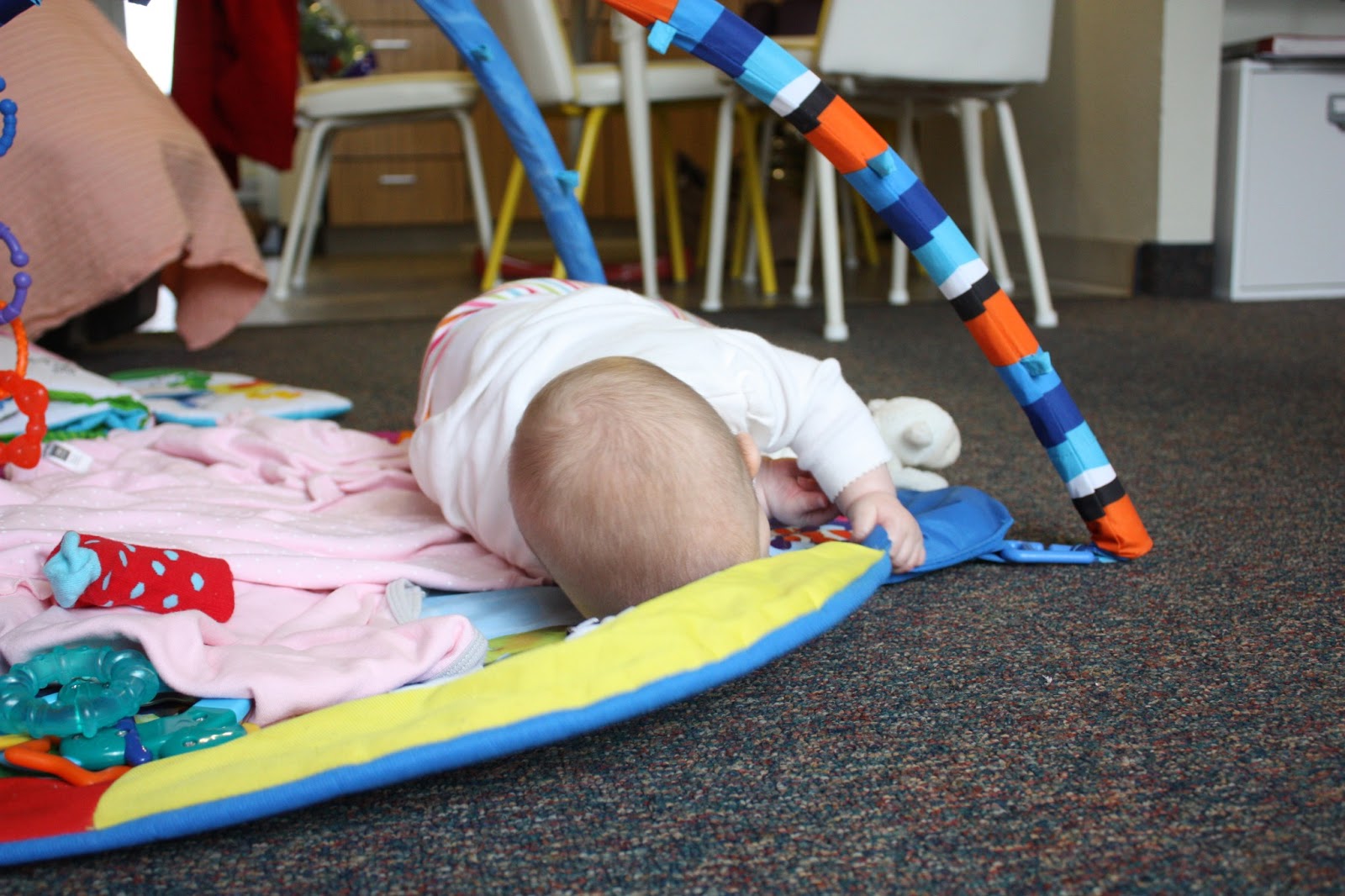 And I missed it. I was facing away from her, chopping the broccoli for dinner. But when I turned to see how my little girl was doing, and when I noticed that my once face-side up baby was now belly-side down, I didn’t miss this: