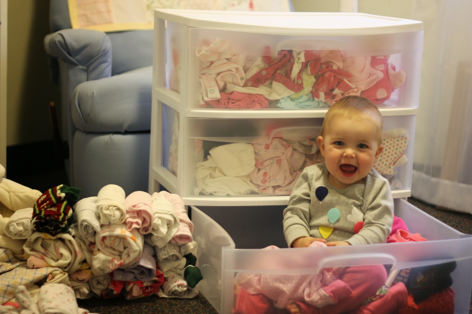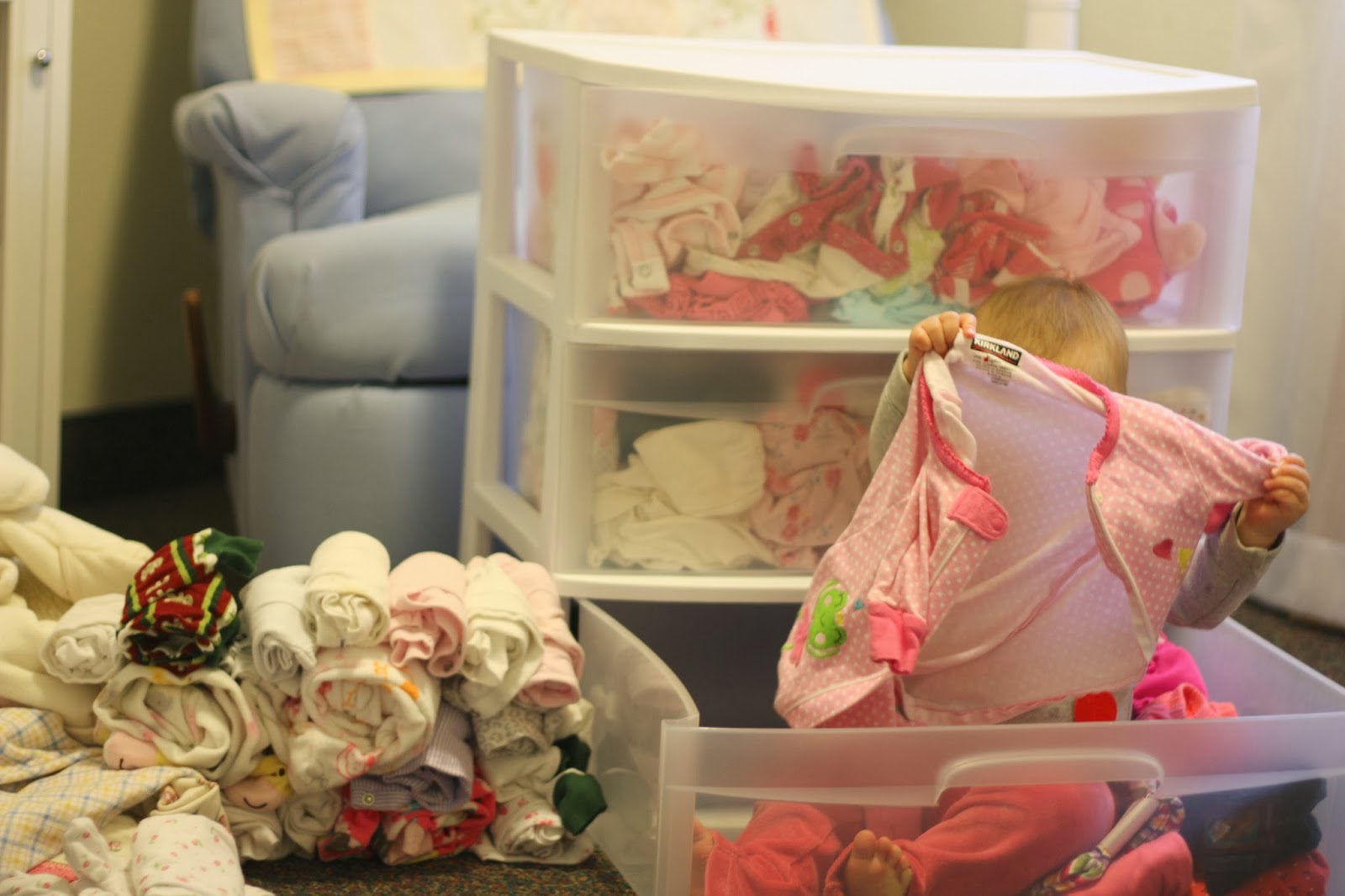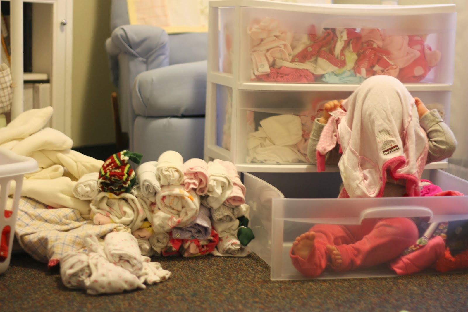 Whatever, I just love cleaning out in the fall. So that’s why Olivia is “putting on her clothes” from her drawers here. She worked at that for a good hour and I organized like mad.