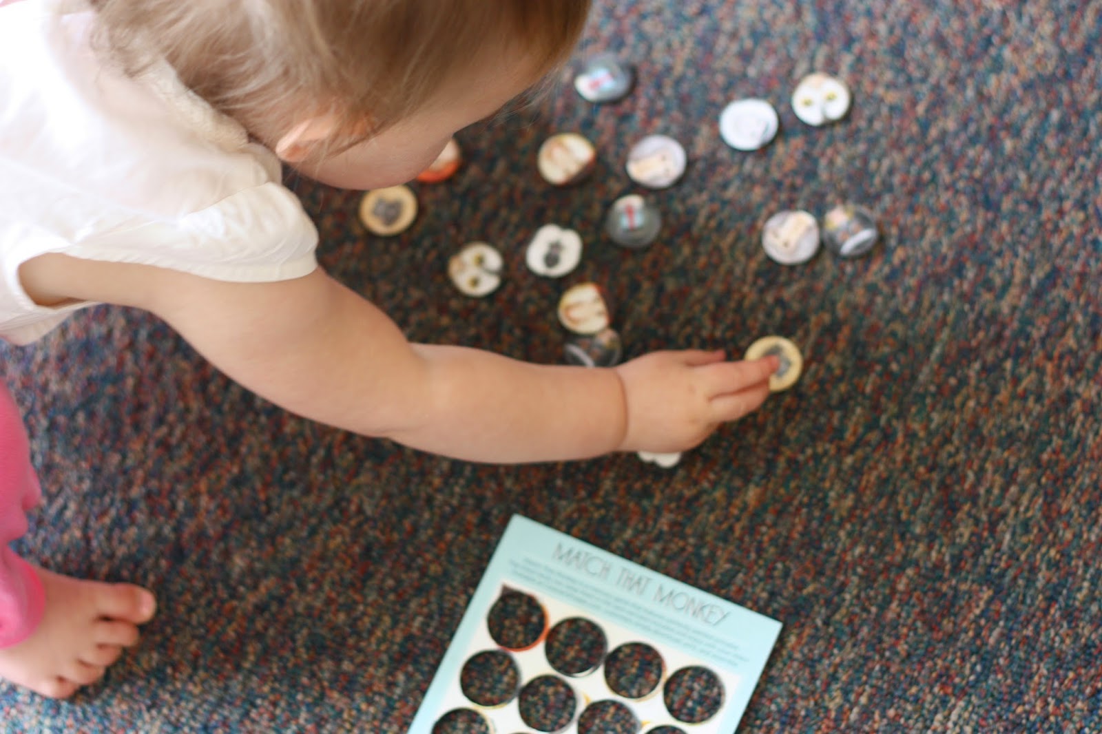 Olivia woke up from her nap yesterday to monkeys. Caravan Shoppe sent me a goodie bag for winning their #createwithcaravan contest last week (it was a happy thing that they picked my photo because I’ve never won anything), and between three prints, some Olliblocks, and cute magnets was the game, “Match That Monkey.” Miss O. went to work the second she saw those chips…