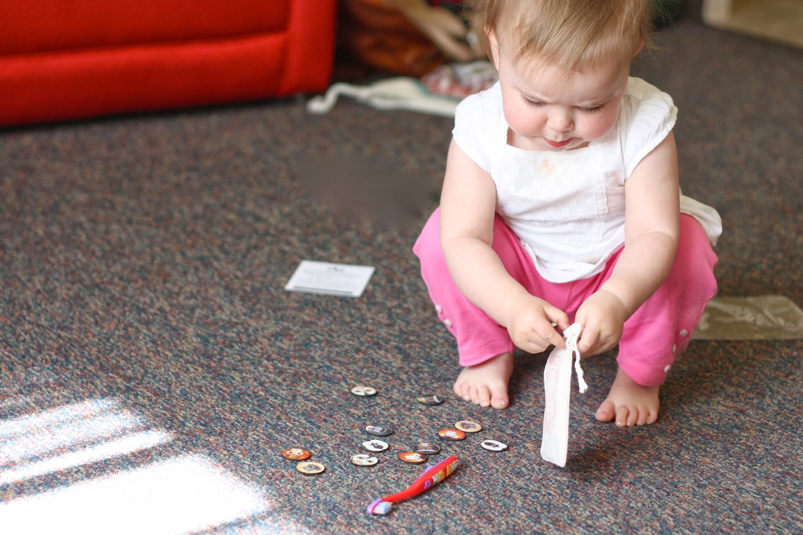 Her concentration reminded me of when she first experienced the splash pad. I love what happens to her when she sees, feels, tastes, or touches something new. She is all business. We’ve never punched circles out of a board before, so that was new. She’s never seen so many real-life-looking monkeys before, so that was new. Let alone in a miniature size, shaped like a circle. Experiencing “new” via playing means work for her. And as everybody knows – working for something is the catalyst for growth.