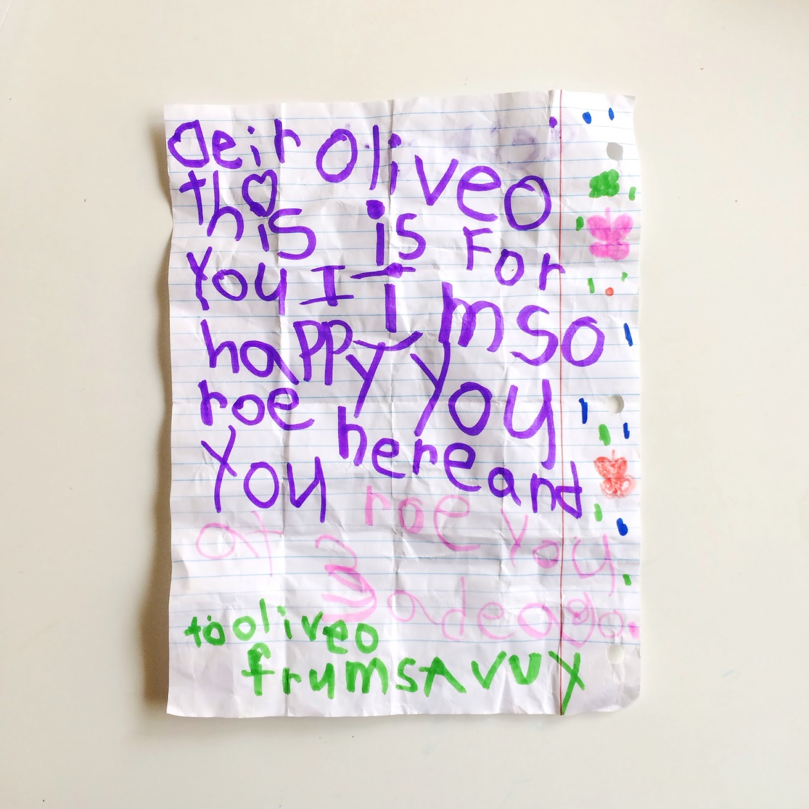 Olivia has also been on a note kick. That sheet up there on the far left with the squiggly lines is a bonafide note from Olivia to someone. That’s her handwriting, and she will read the note to you if you kindly ask (please note, the note is subject to change 🙂 ). Lucky for her, her best friend, Savvy, jumped on the note train, too…