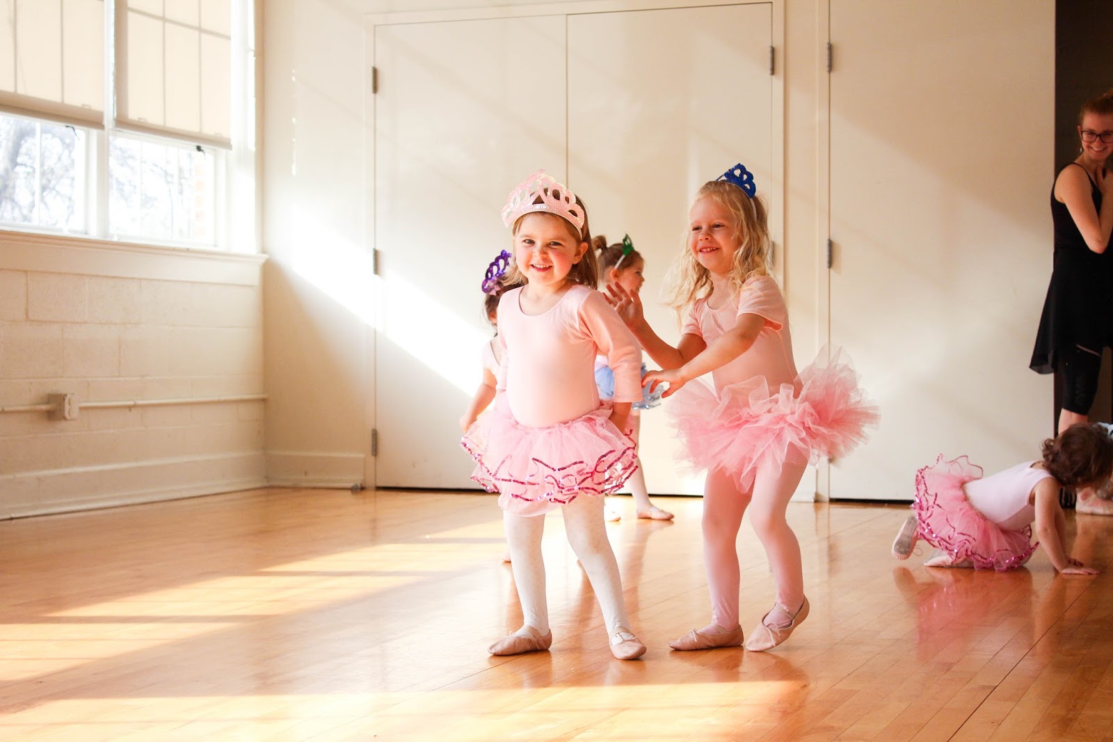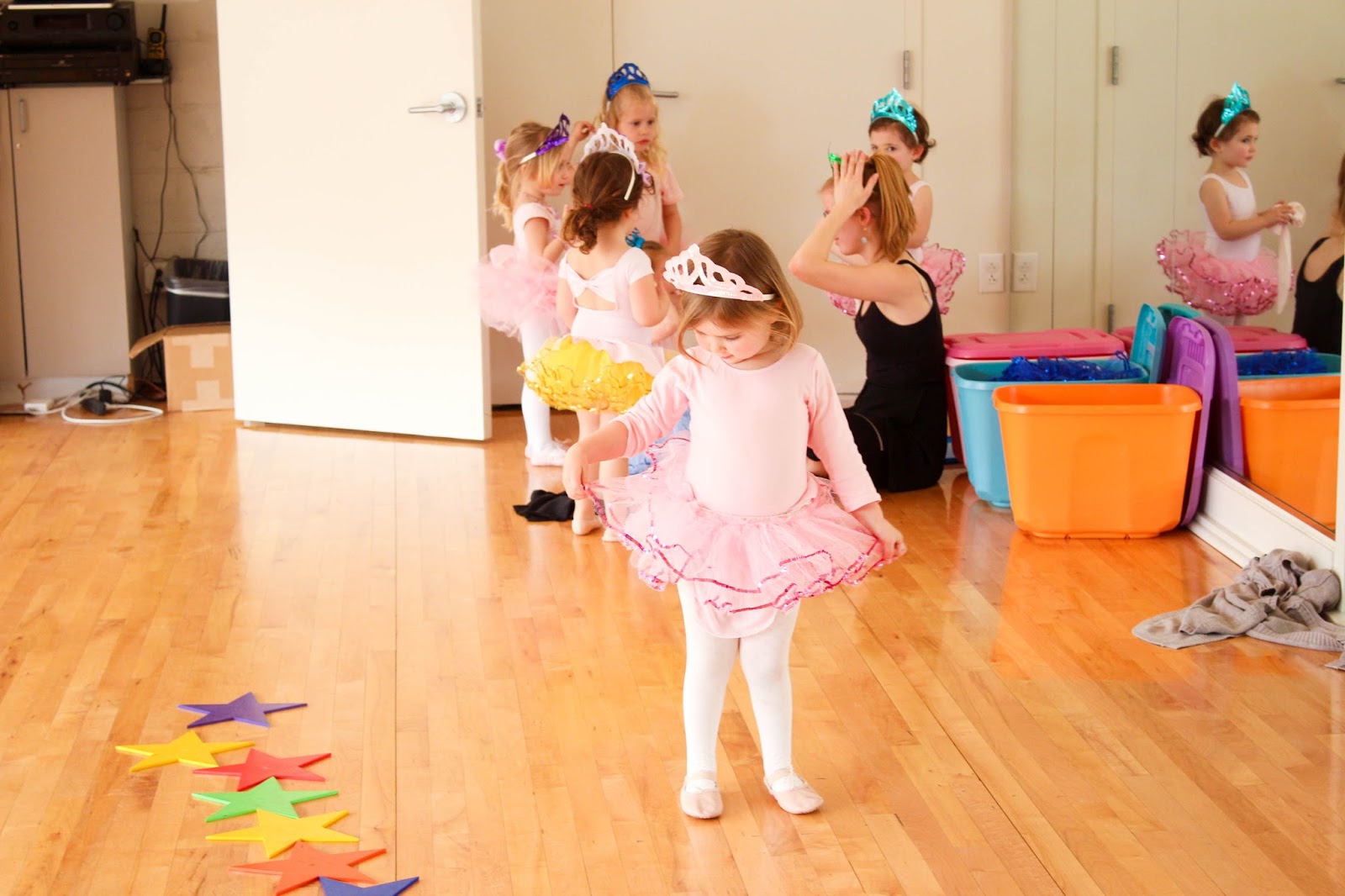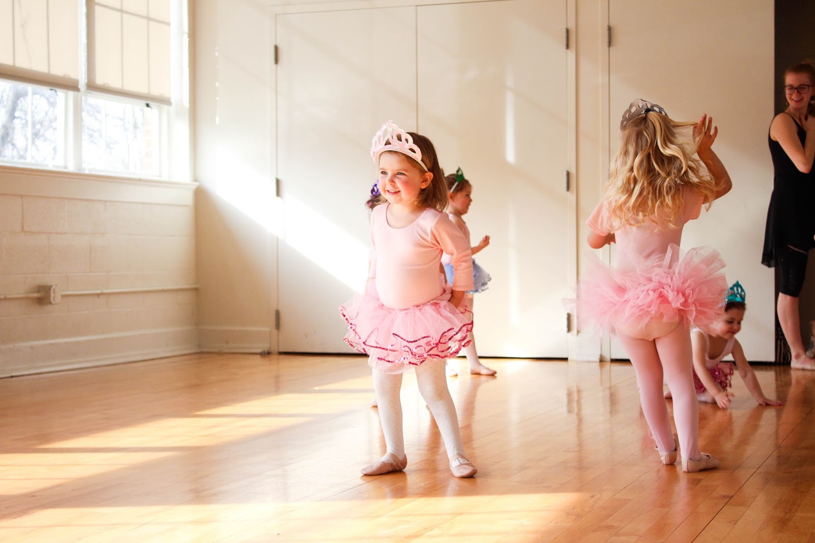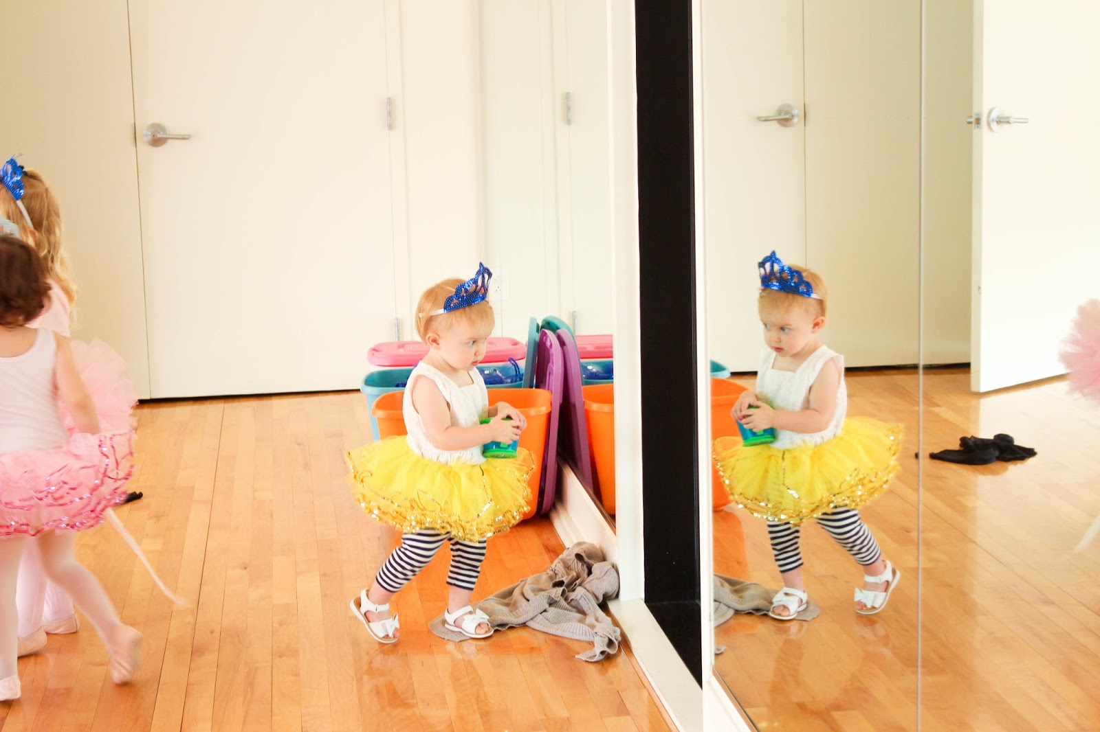// Claire just longing to join the girls but refraining. UNTIL the tutus and tiaras came out. Then sweet Claire got too close for her sister’s comfort, and Olivia turned to Miss Marsha and said, “Miss Mawsha? Can my sister Quare pwease have a tutu, too? And a quown?” Then Olivia helped dress her sister and, Miss Claire, the newest ballerina in the class, joined in. Yes I melted.