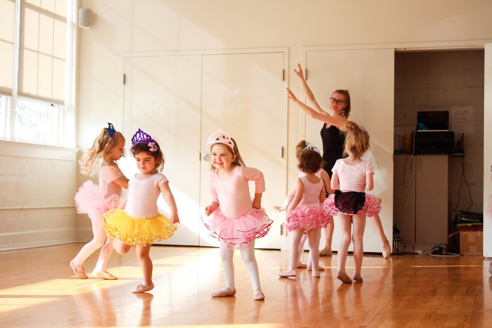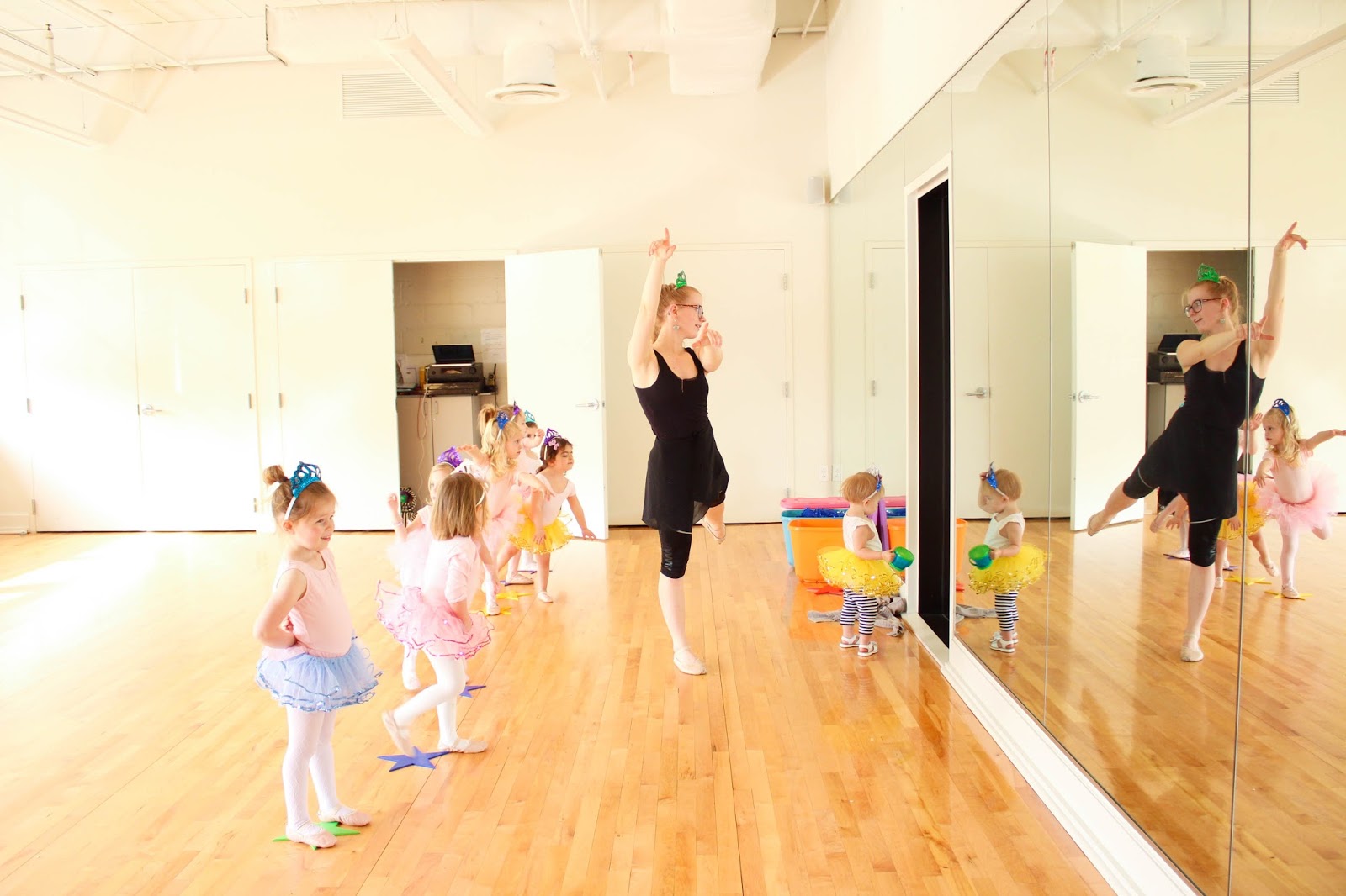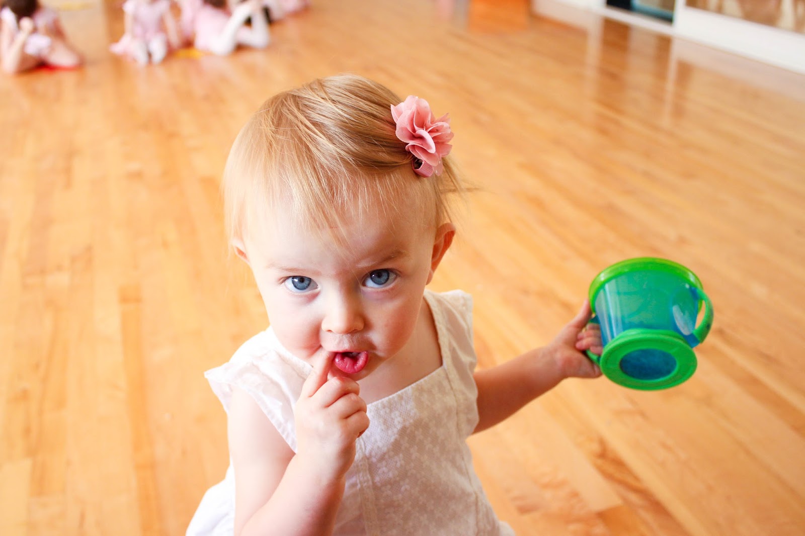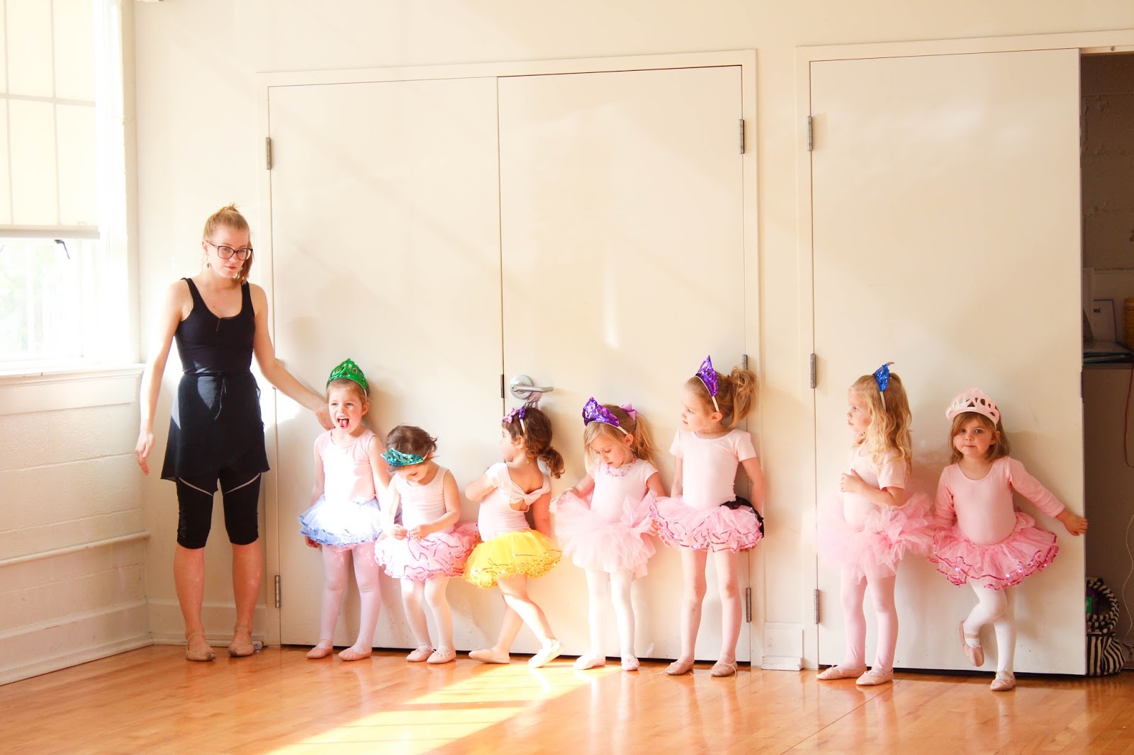 // Claire just longing to join the girls but refraining. UNTIL the tutus and tiaras came out. Then sweet Claire got too close for her sister’s comfort, and Olivia turned to Miss Marsha and said, “Miss Mawsha? Can my sister Quare pwease have a tutu, too? And a quown?” Then Olivia helped dress her sister and, Miss Claire, the newest ballerina in the class, joined in. Yes I melted.