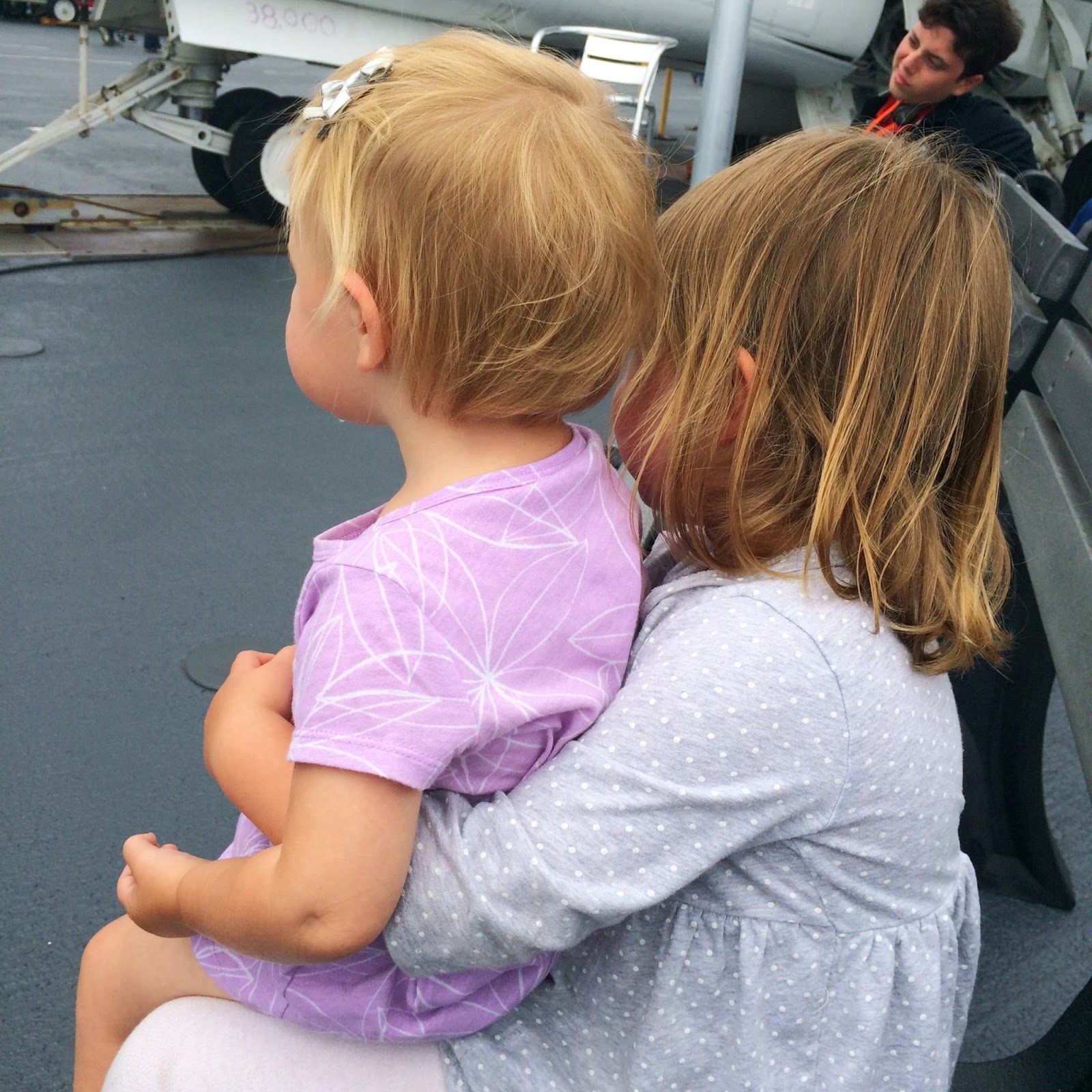 Claire had been sleeping in the stroller while we listened to a veteran talk about the ship, and when she woke up Olivia said, “Come here baby, let me hold you.” Makes me smile, because Claire is developmentally gaining on Olivia, which they both know, and yet they both love that Olivia still dotes on her baby sisto. I love these two.