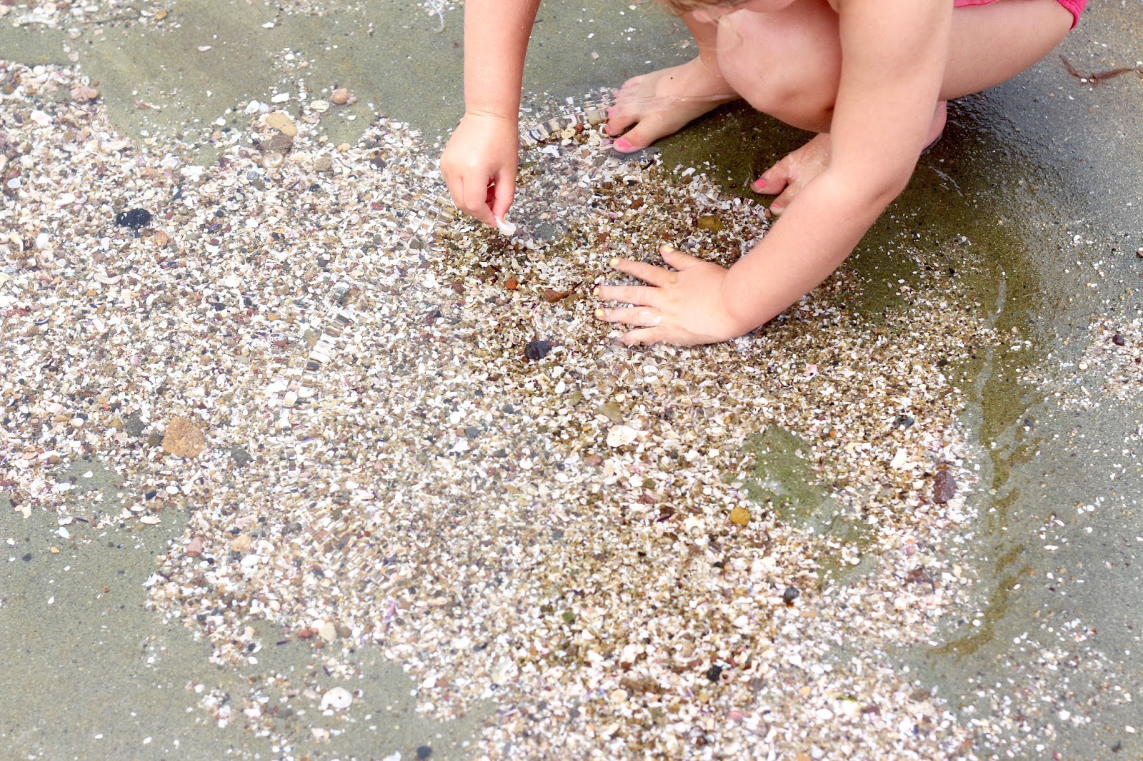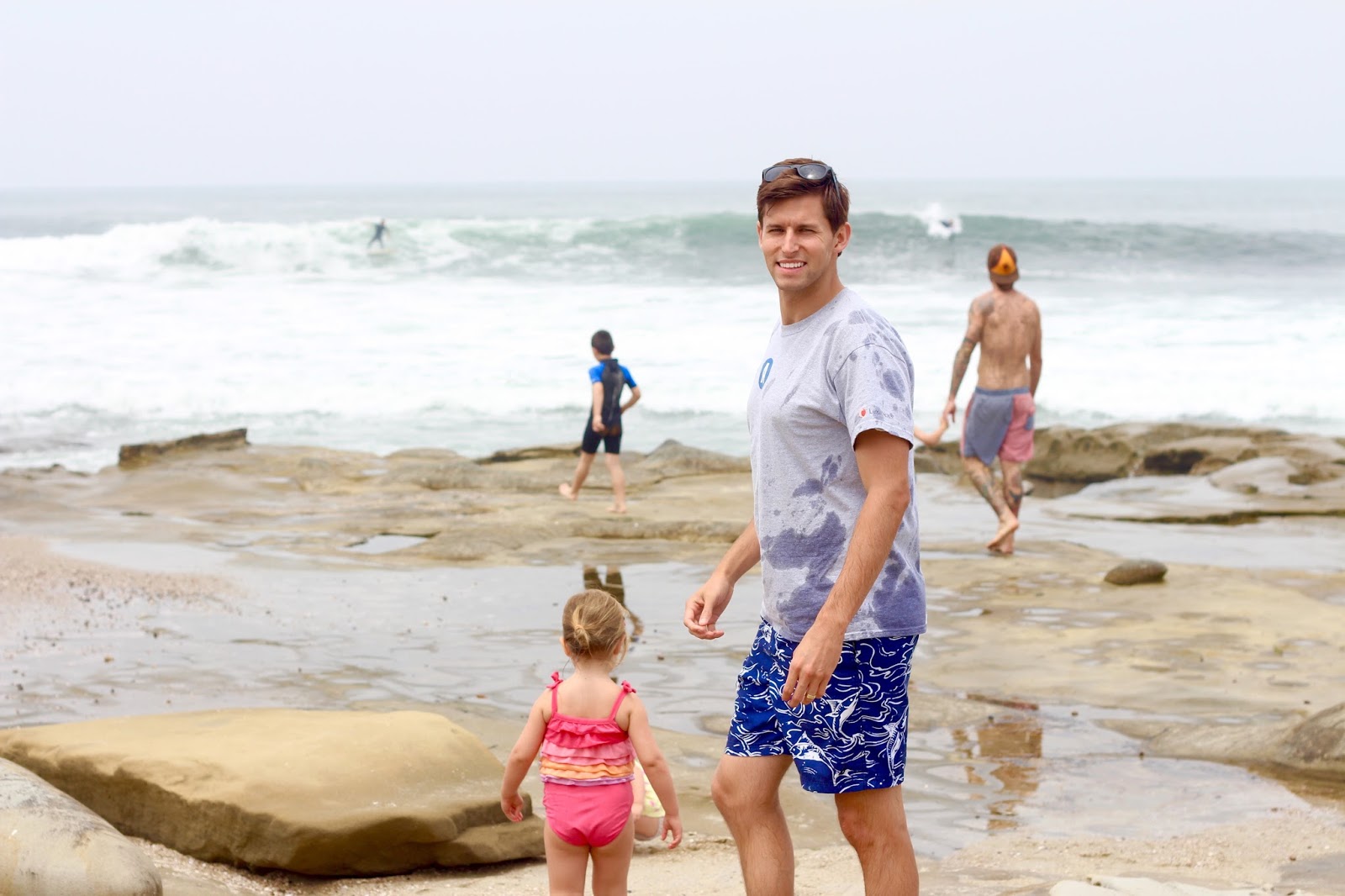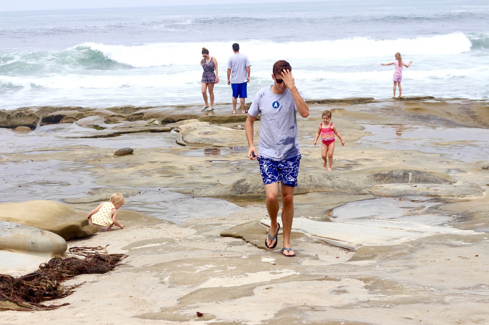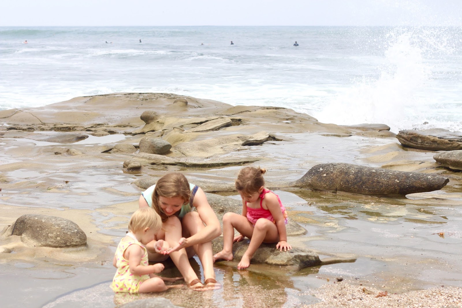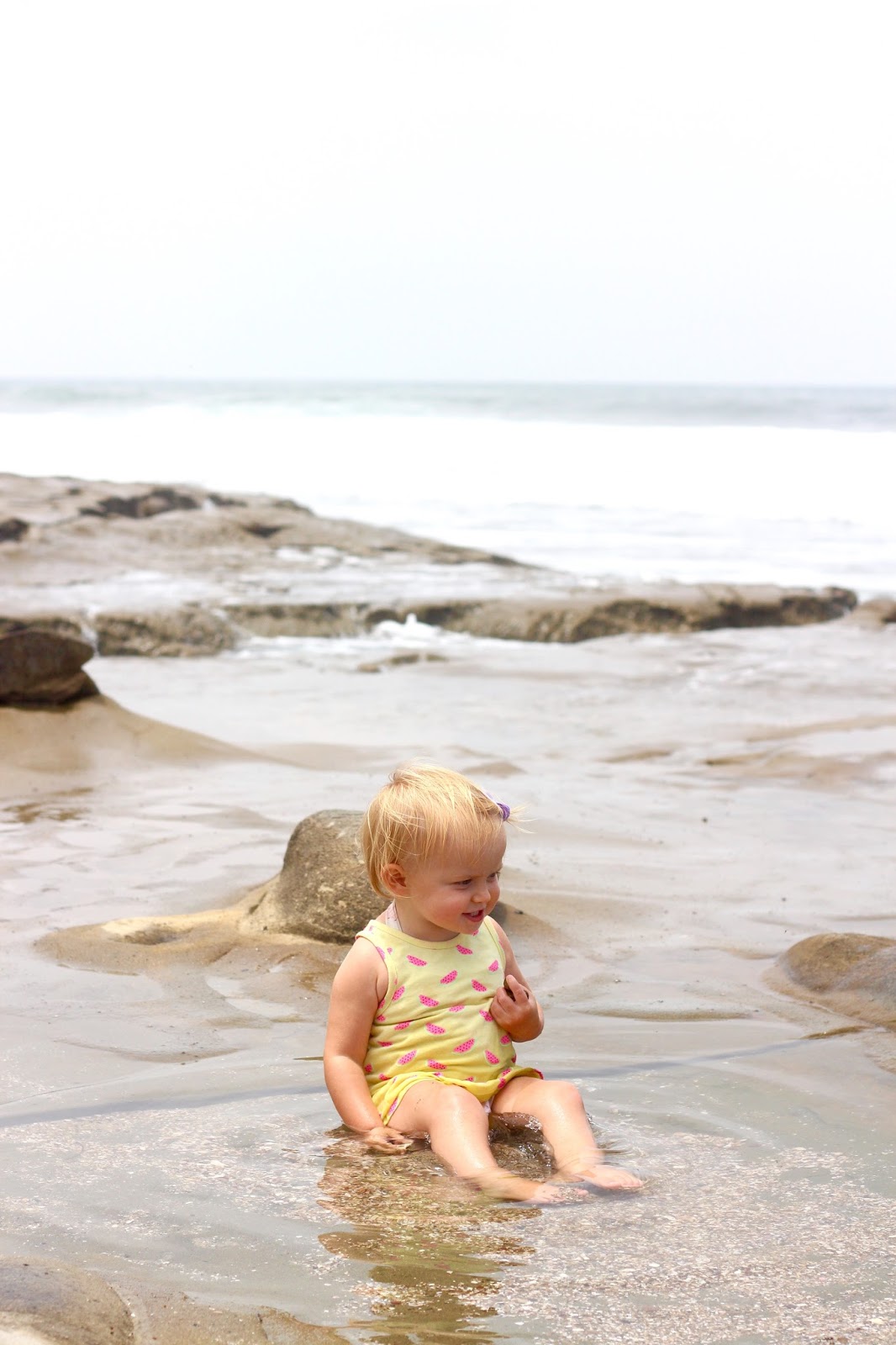 We went to the tide pools here in La Jolla, and holy wow. It was beautiful + we’re officially in love. I know that the spot is popular – but for any beach-life newbie like me out there – you must put this on your to-do list the next time you’re in SD! The “beach” was unlike any I’ve ever enjoyed, which added a lot to the beauty for me. There isn’t sand, just rock; locals still set out beach towels and chairs to soak up sun, waves, and water. The tiny pools and endless amount of shells to collect and creatures to find made it such a winner for the girls. The best part — the water that collected and had been sitting in the pools that morning was WARM. As in it had no ocean chill at all (!!) We were up and down, in and out of those water spots the whole time. I loved it.