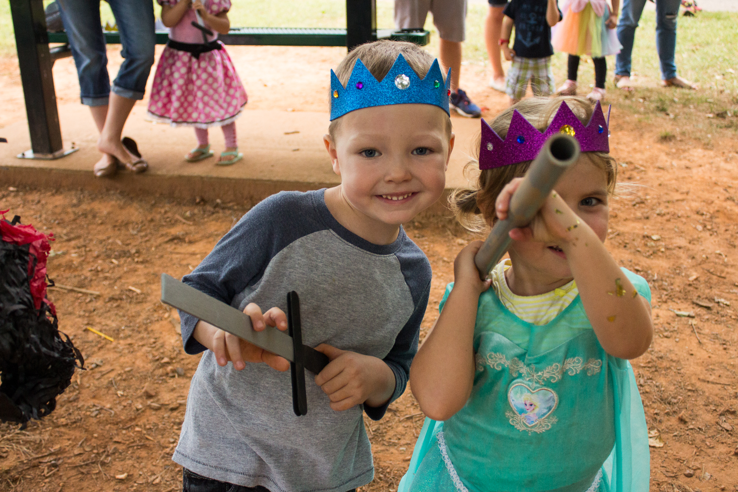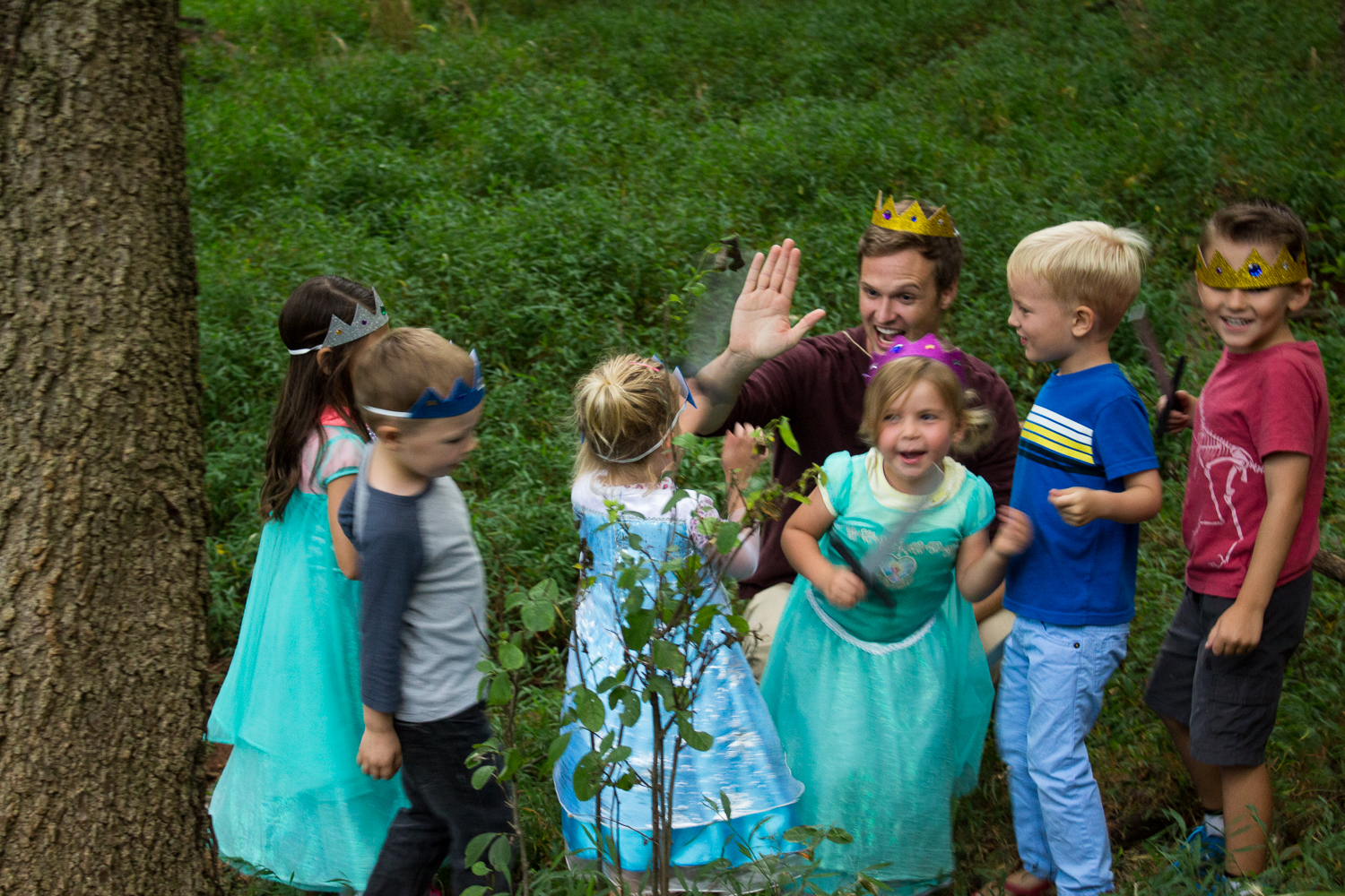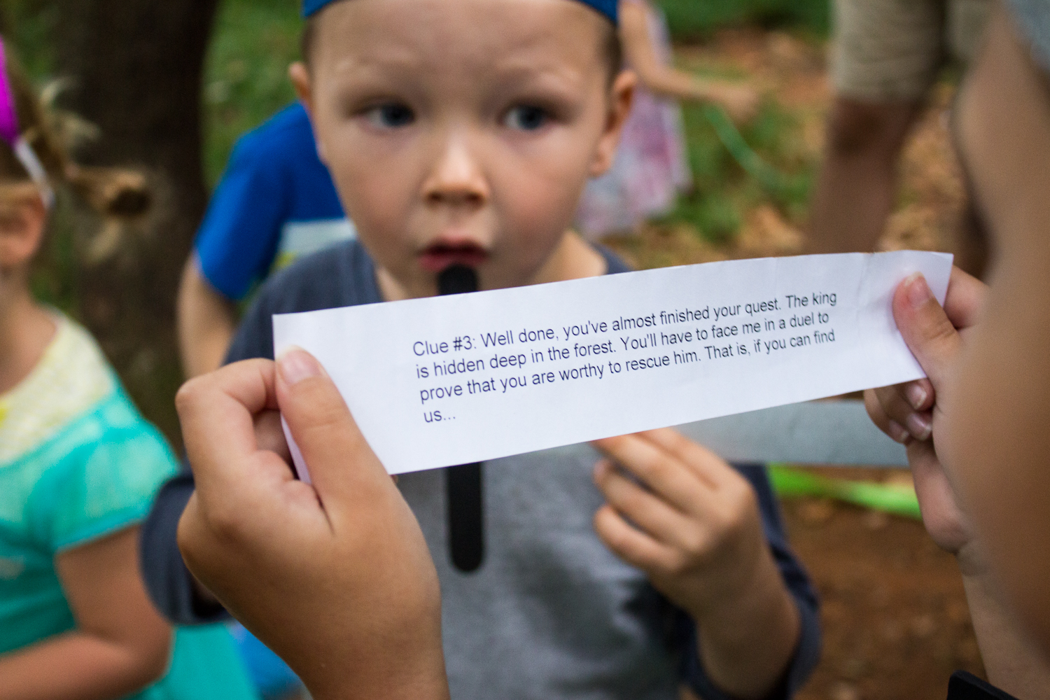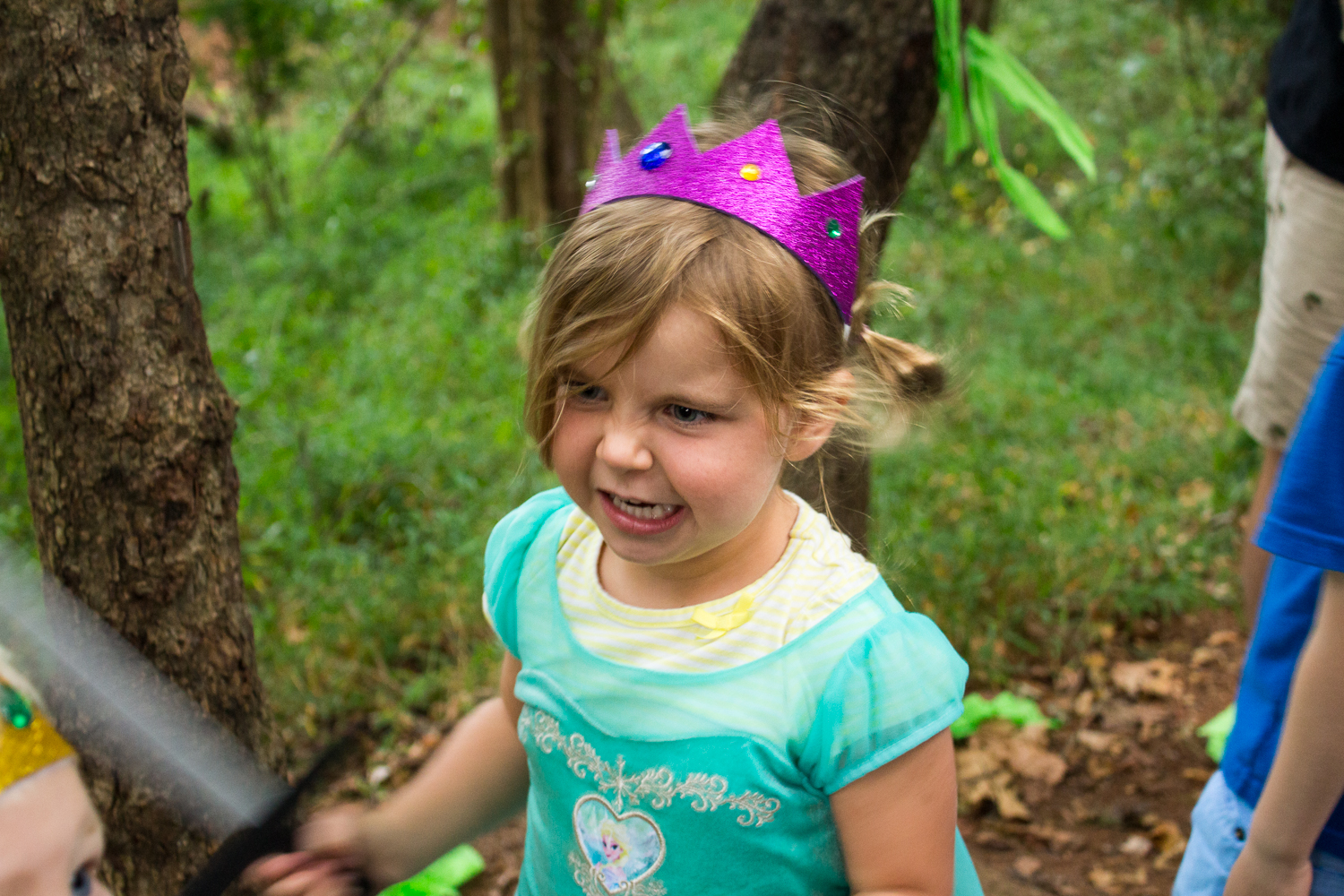 Oliver’s mom, Rainy (one of my best friends here!), and I planned the party, playing on the four-year-old’s wild imagination — we dubbed it a Prince and Princess Party centered around a quest. The kids would get homemade crowns and swords when they arrived, and then they would follow three clues – through the Virginia woods, offf course 🙂 – to find the captive king (Oliver’s dad, Brandon) that had been captured by the wicked villain (Olivia’s dad, Ryan). You guys! It was a BLAST.