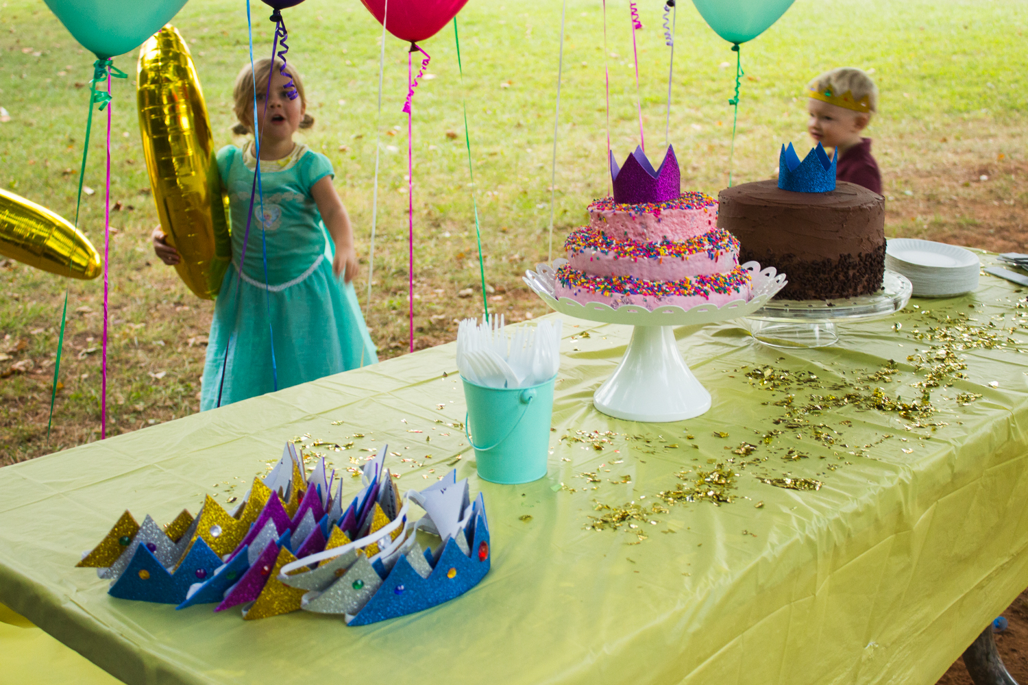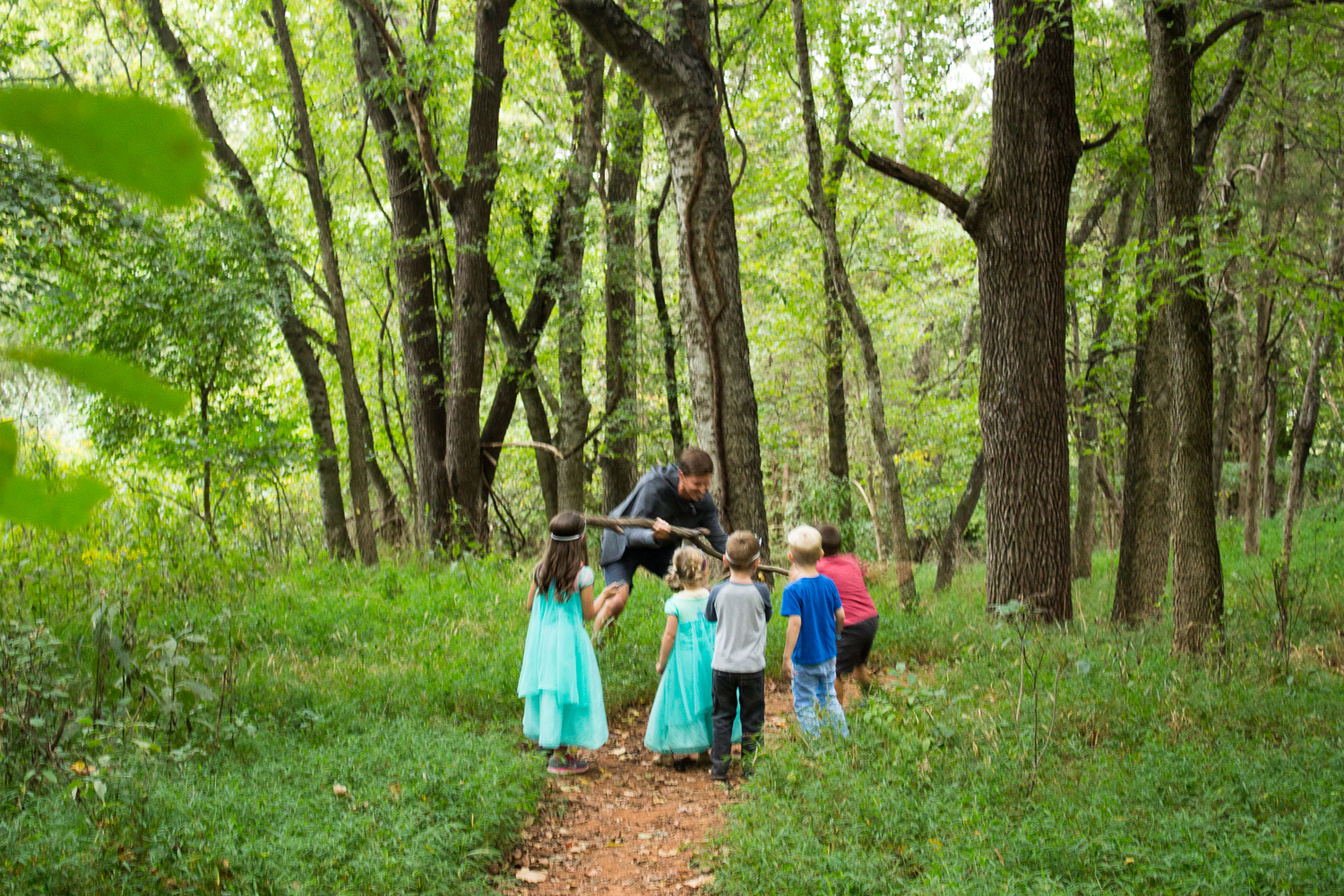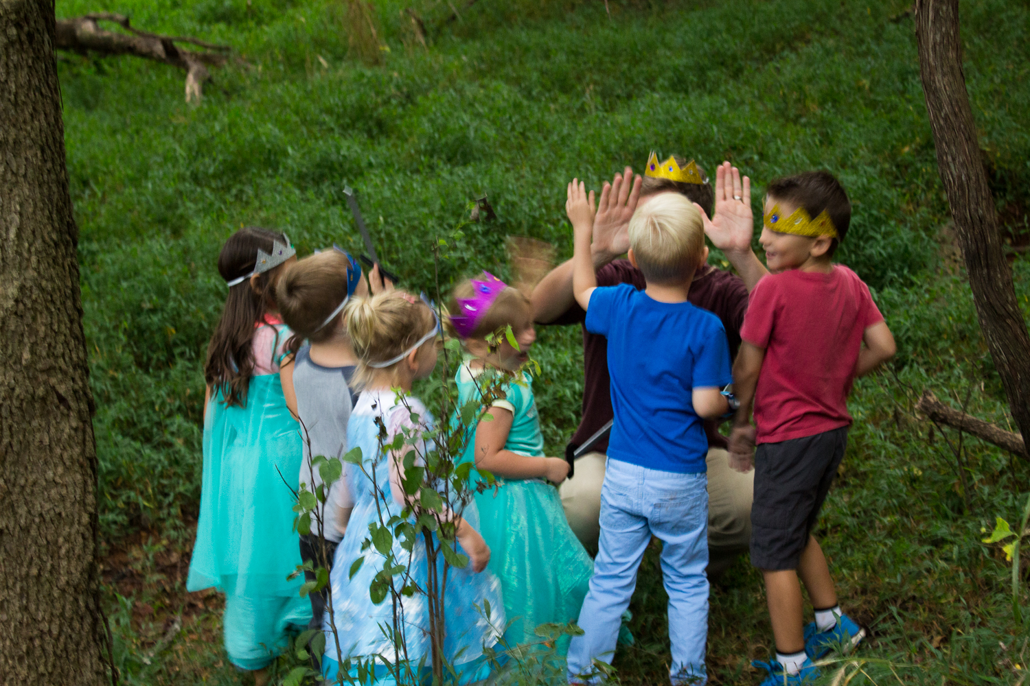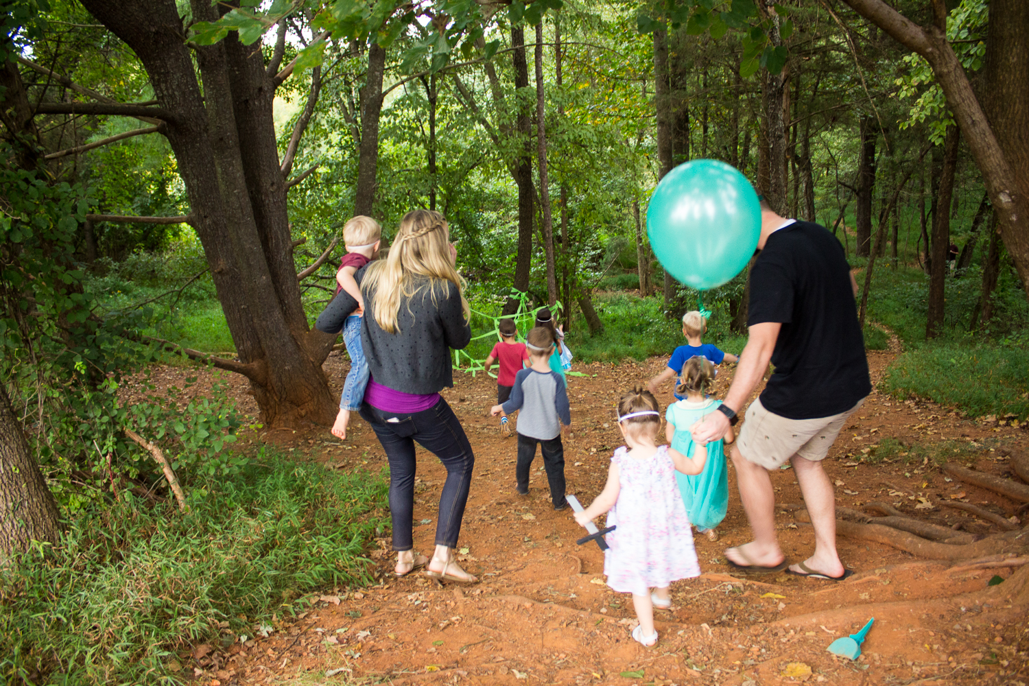 Oliver’s mom, Rainy (one of my best friends here!), and I planned the party, playing on the four-year-old’s wild imagination — we dubbed it a Prince and Princess Party centered around a quest. The kids would get homemade crowns and swords when they arrived, and then they would follow three clues – through the Virginia woods, offf course 🙂 – to find the captive king (Oliver’s dad, Brandon) that had been captured by the wicked villain (Olivia’s dad, Ryan). You guys! It was a BLAST.