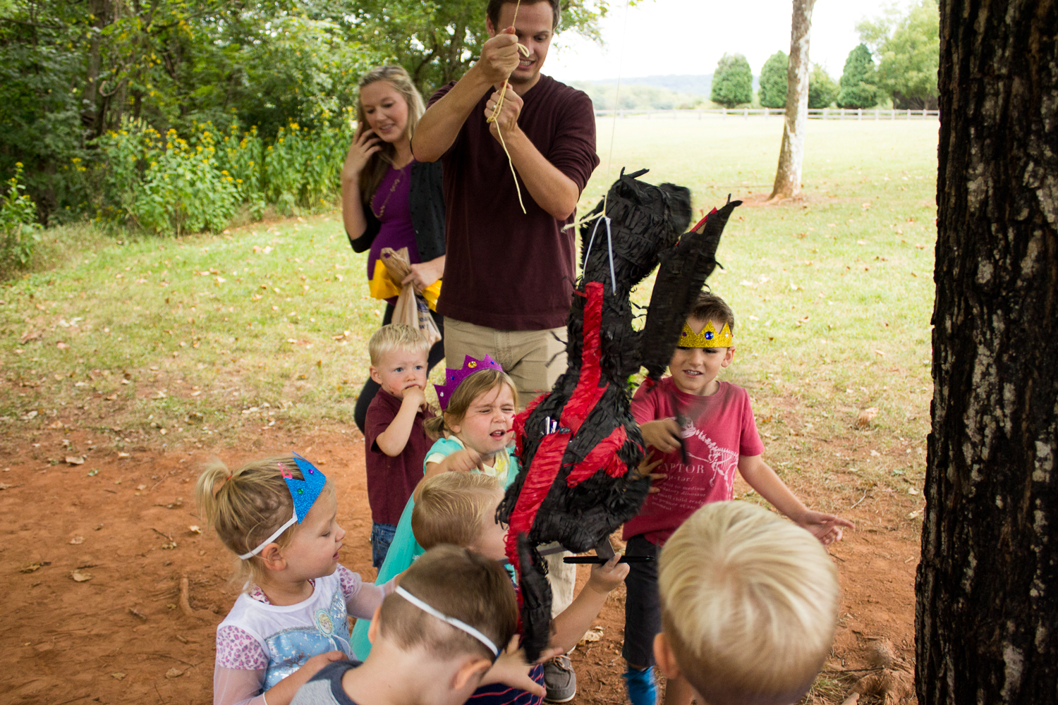 To top things off, we climbed out of the woods and back to the party table to slay the dragon (piñata) – the dragon was angry that we had popped her eggs! – and we should’ve scripted this part a little better, too, because naive me, I just said “Okay kids, charge!” and this happened…
