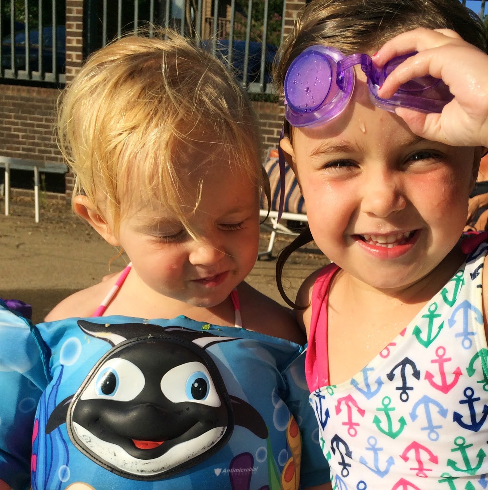 Claire was right there with us floating in her floatie (on her back – her favorite spot) as Olivia swam right on top of the water, face down, legs kicking, and arms stretching from a step at the end of the pool to where I stood, probably 15 feet away. We’d cheer for Olivia for being so awesome, and then Claire would take a turn jumping into the pool from the outside ledge. Splash. We’d cheer for Claire for being so awesome.