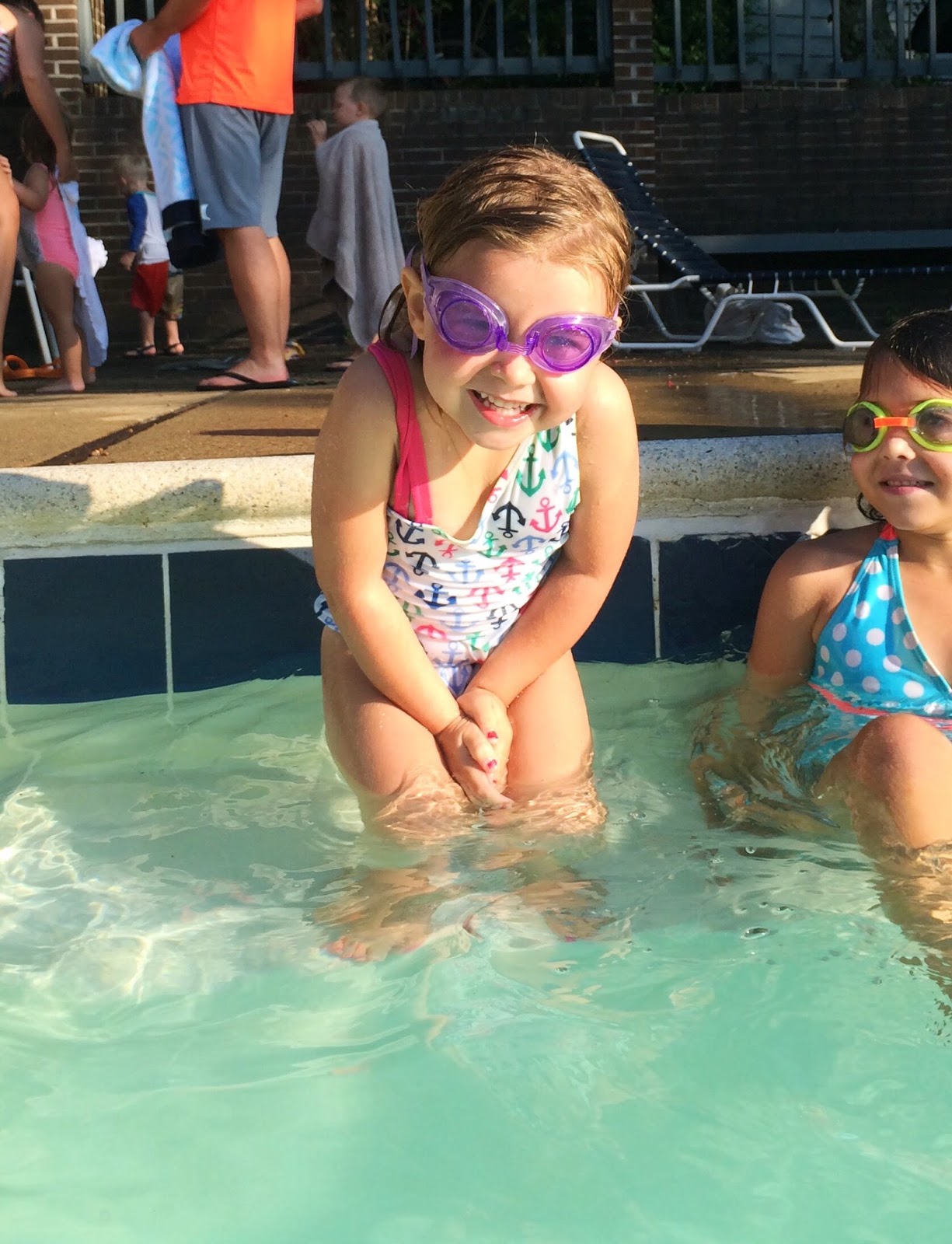 All the pools in Charlottesville close on Labor Day, so a lot of our friends all gathered yesterday for a final swim. Ryan was in class, sadly. Except for that since he wasn’t there, Olivia was anxious for me to play with her + give her a swimming lesson. It’s been Ryan’s privilege all summer to do both, mostly because I honestly dislike getting all the way in the water (makes me too cold!), but I mustered my courage for her sake, got in bicep deep, and played. It was so much fun.