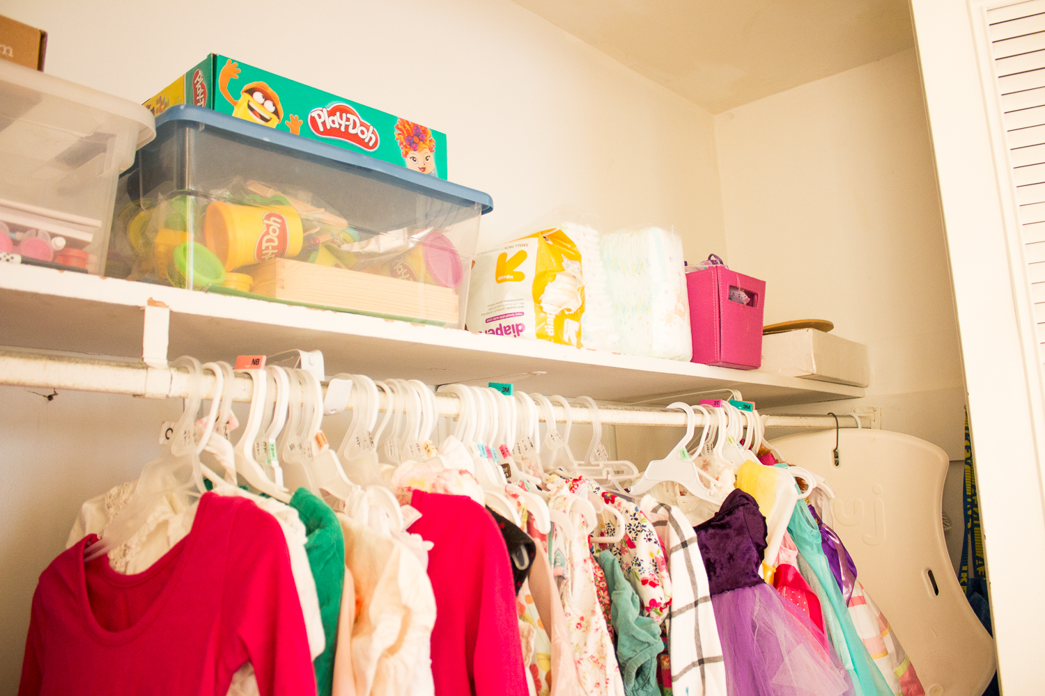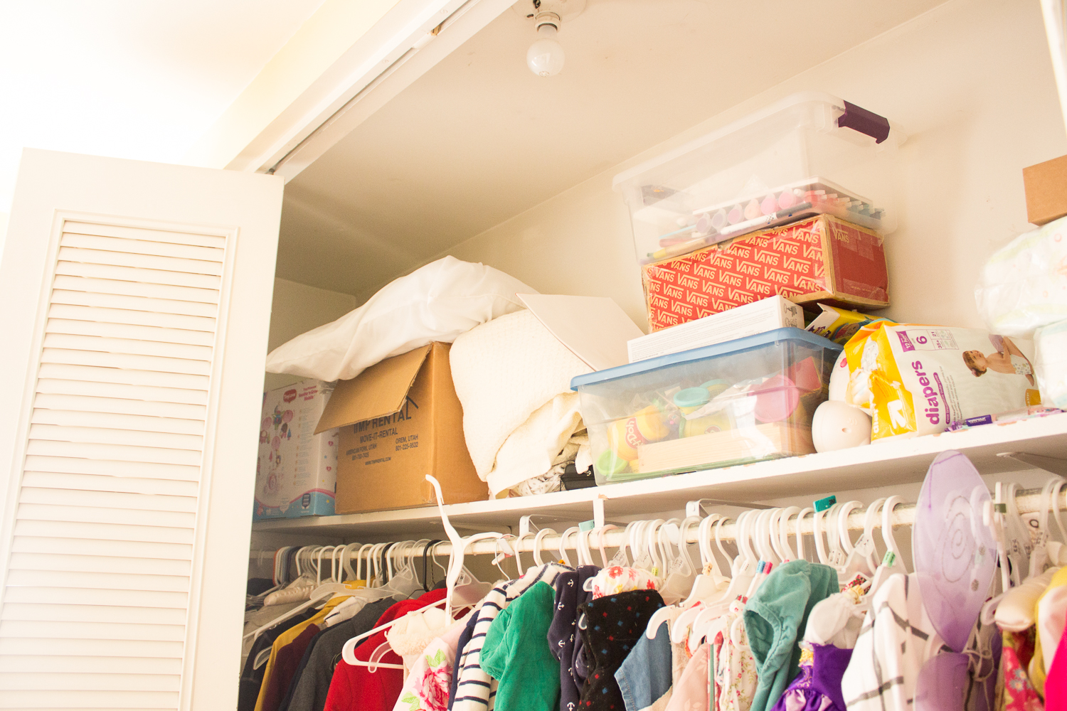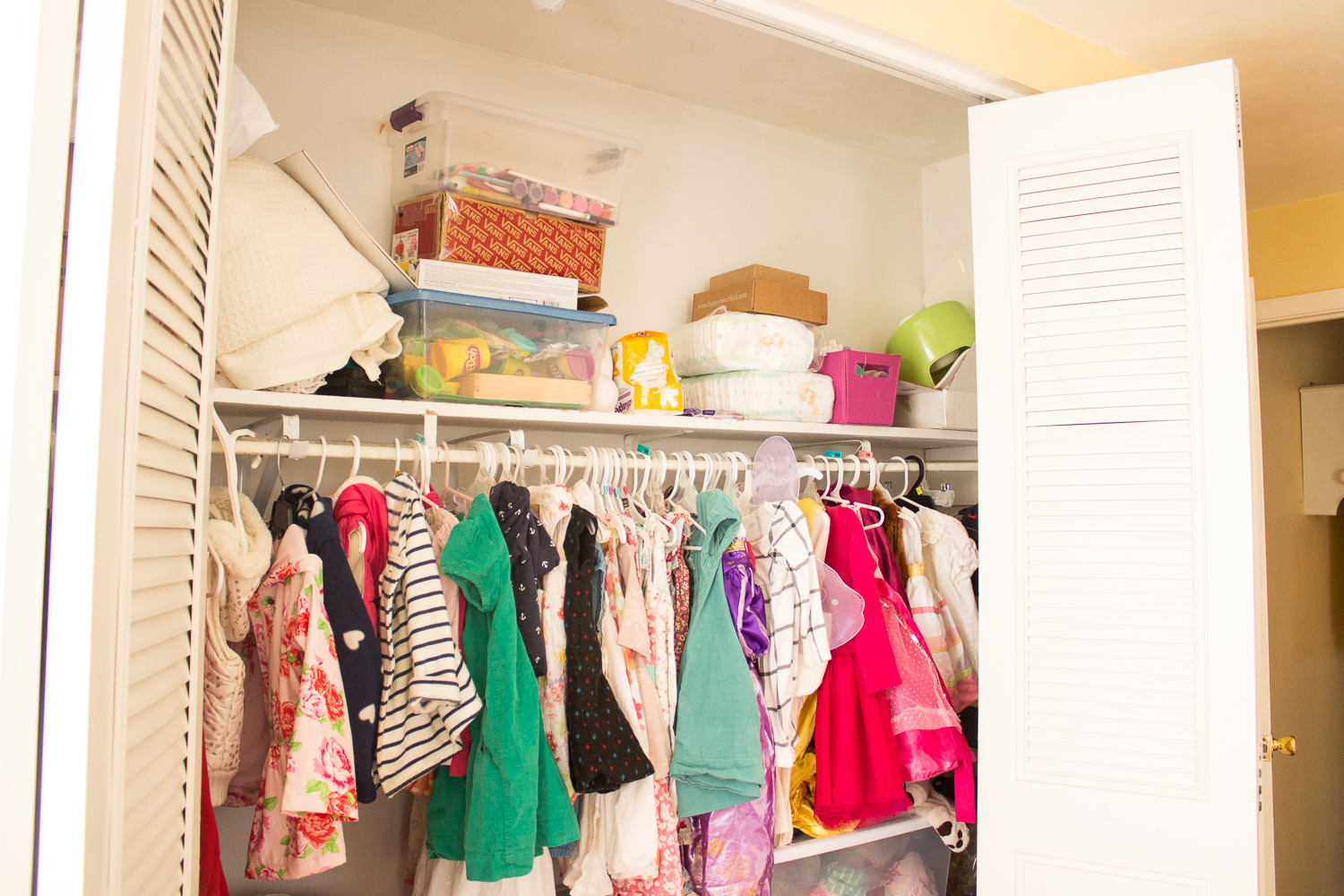 Here are a couple closer “before” and “after” shots of the girls’ closet for kicks. The top shelf before…