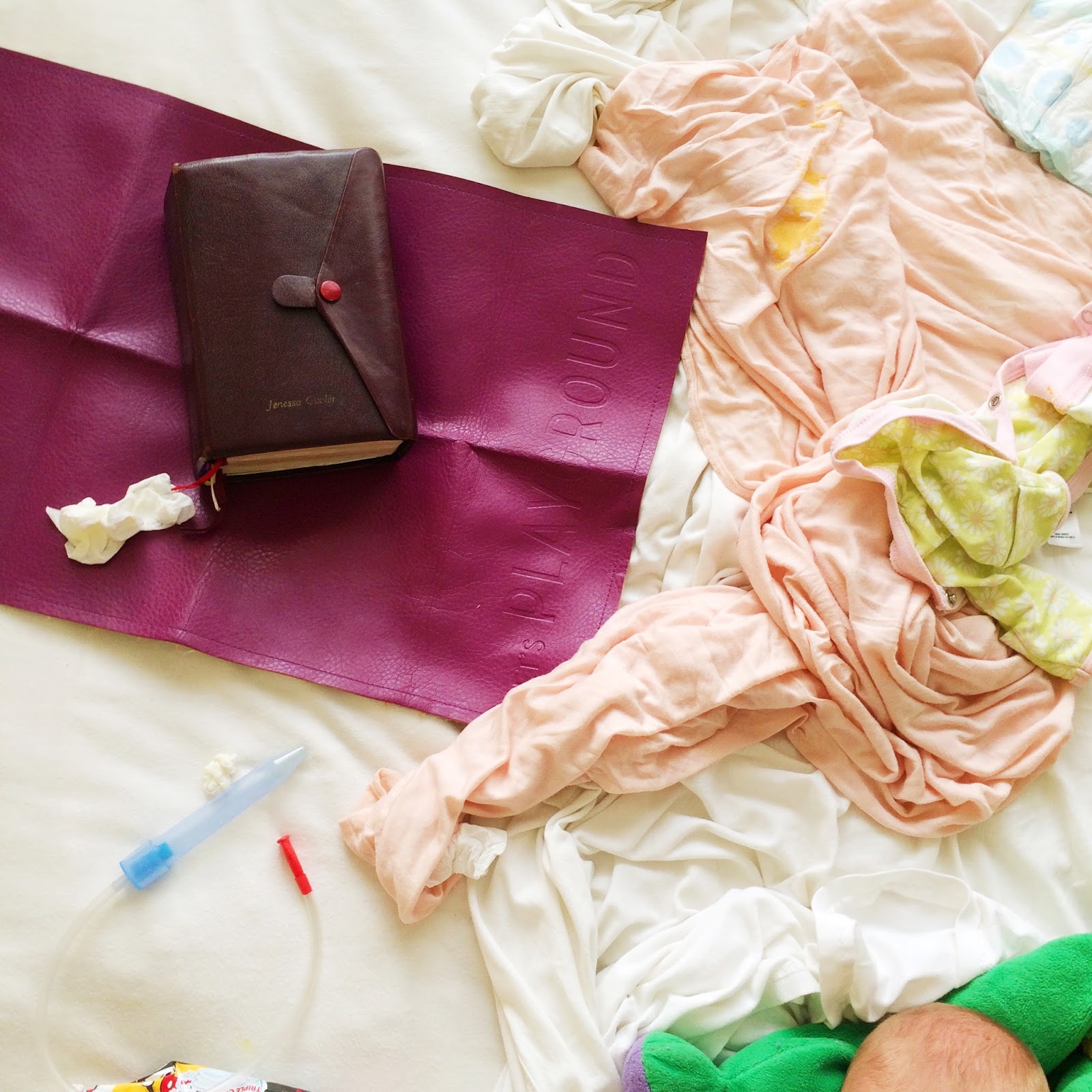 Pic via: the HEAT of the moment! 😂 Would you look at that scene down there. Poop on the Solly Swaddle. Diapers. Tissues. Our best friend, Nose Frieda (my favorite contraption). Pajamas, the mat, wipes, and a tiny bit of Baby Emmy head.