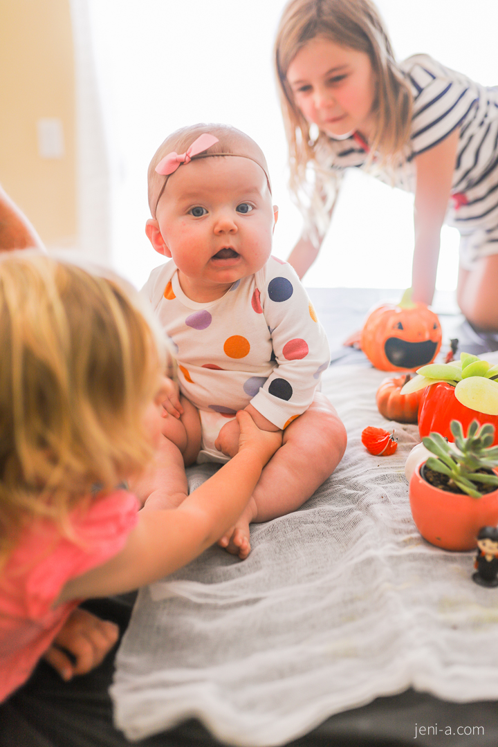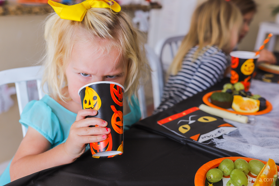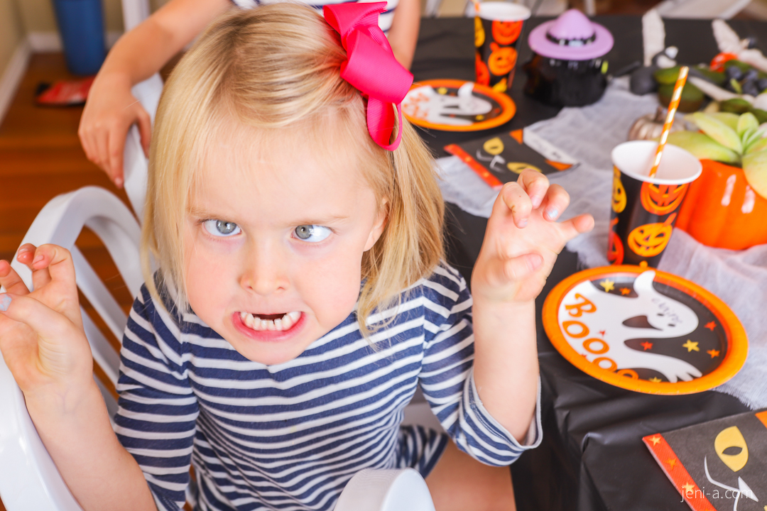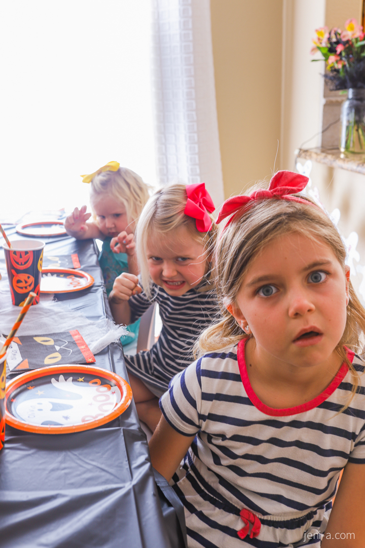 The girls helped me put the finishing touches together for the food, and they oohed and ahhed over its final presentation. They totally opened up about their worst nightmares and biggest fears, which surprised me –I thought their responses would be silly — but they were actually pretty serious and you bet this mama took note. 🙂 We played a ball toss game with candy at the end for those whose balls made it into the far-away buckets. The movie didn’t pan out, since we couldn’t find the TV remote (we still can’t find the remote, haha), so we just played some more and had a blast. It was so nice to do something so fun and novel to our little family. A tradition was born! But really. I already have next year’s “Freaky Feast” menu planned out. Makes me happy. I love loving my little crew!