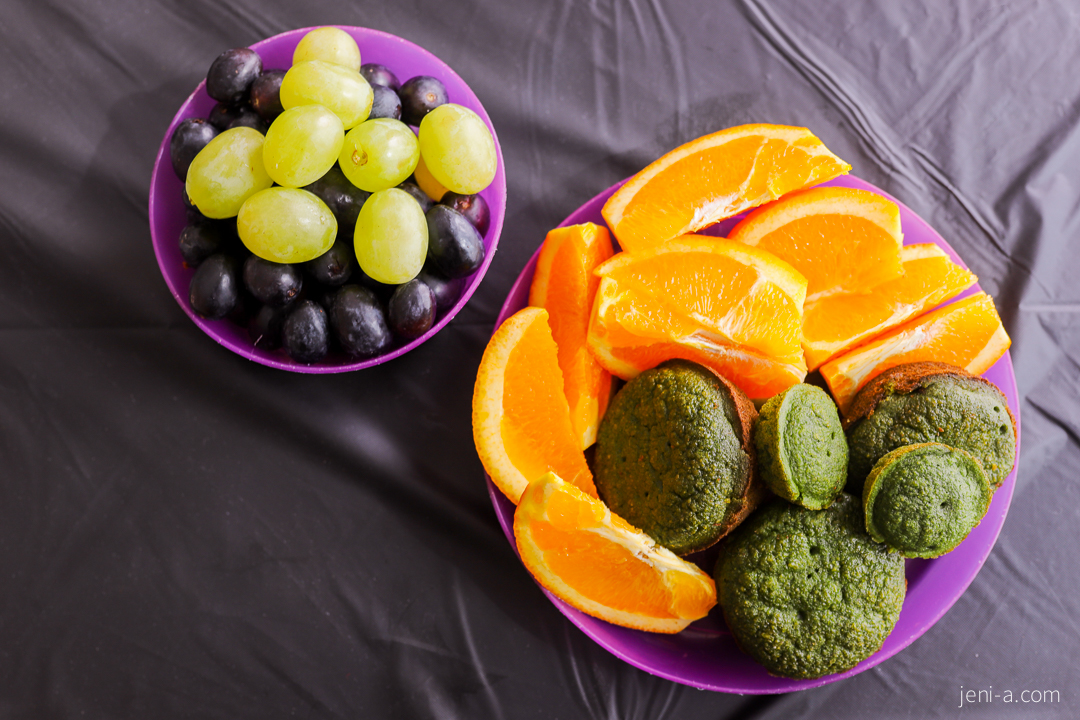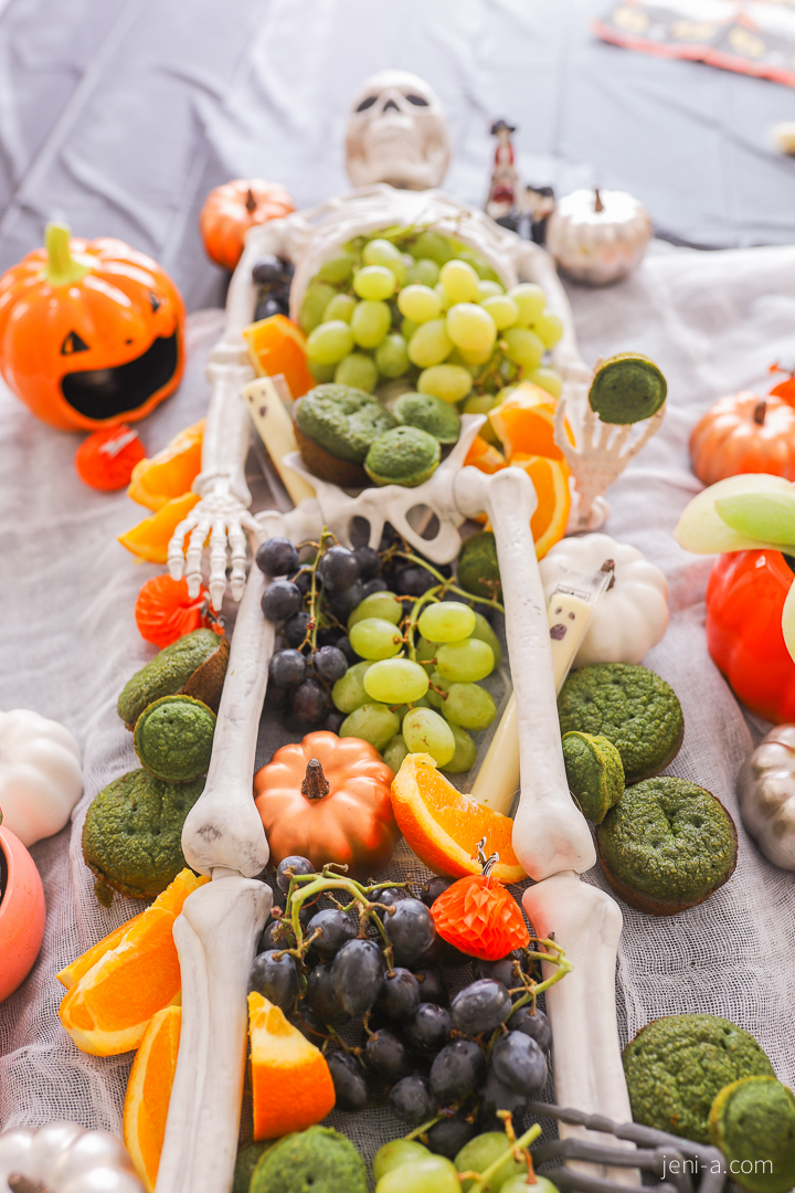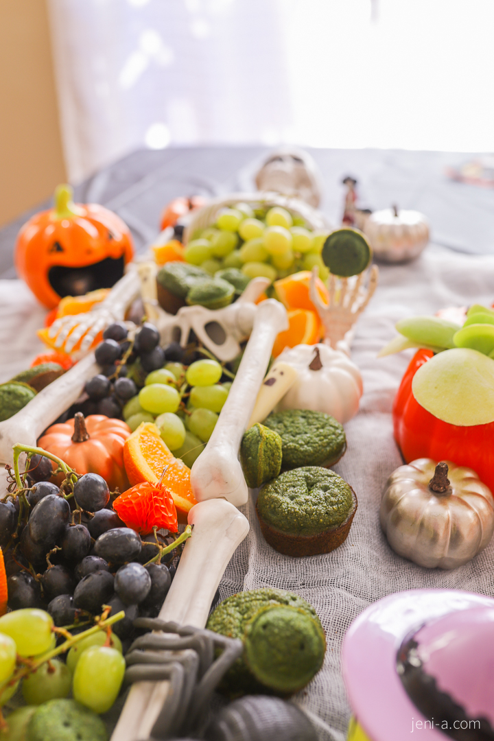 PS, this was such an easy, fast party to put together. You really only need a handful of Halloween decorations to place around the skeleton (I used small pumpkins and figurines and spiders, etc., that I’ve snagged from Target’s $1 section over the years), a small skeleton, and some themed food. Our menu this year is below — purple and green grapes, oranges, and a double-batch of  these green muffins (make a batch of mini and regular sized muffins, and add more honey to make them sing). It was a brunch! And it was a blast.