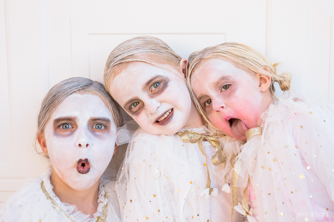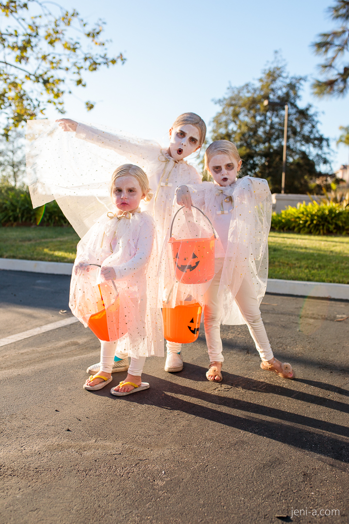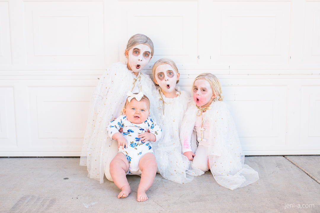 The GHOUL GANG. The girls’ costume request for Halloween night this year was to be ghosts. “And not cute ghosts, Mom,” Olivia said. “SCARY ghosts.” I don’t love scary (and honestly, she doesn’t either, haha), so we compromised by putting them in glittery capes and giving them some awesome black eyes. And yes, Emmy’s face WAS totally white and her eyes WERE totally black — Sis took her makeup into her own hands while I was nursing Chloe, just after I finished getting her all ready — she decided she needed some lipstick. Just a little bit mom (read: enough to cover her whole face and half of her white shirt. Look closely…ahhh well!)