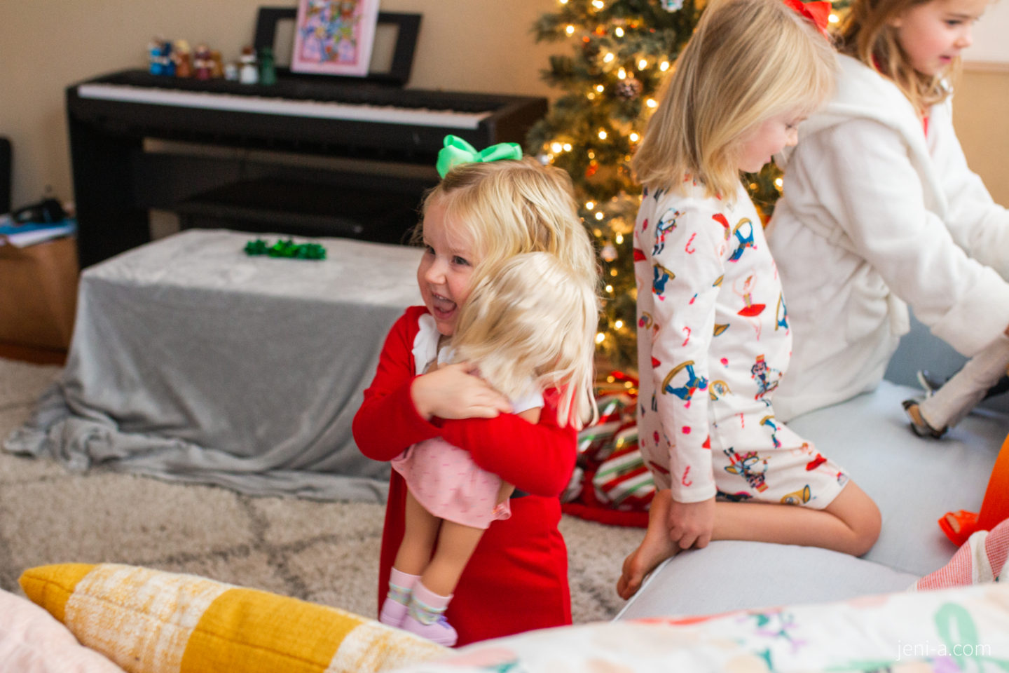 After dinner with our friends, we read the Nativity Story and then it was off to bed. I never want to forget how we did not sleep the night of Christmas Eve thanks to a particular little girl in the brigade that just could not sleep…Olivia was up all night, so excited for Christmas morning. She first came into my room around 2:00 AM to tell me that she had had a good dream and was “just up for a sec.” I was delirious and told her to go back to bed and fell asleep again, but she stayed up from there on out and periodically came to tell me things from there about what was going on, like how Santa had “seriously landed on the roof! He’s here!” and how she looked out her window and saw reindeer running around on the street. And she was not kidding. The sleep deprivation caused a little hallucinating, I believe, haha! She had never stayed awake for so long — or had so much adrenaline pumping through her little body? It was darling and draining all at once, and she crashed on Christmas Day. Staying awake all night on Christmas Eve — a childhood rite of passage. 🙂