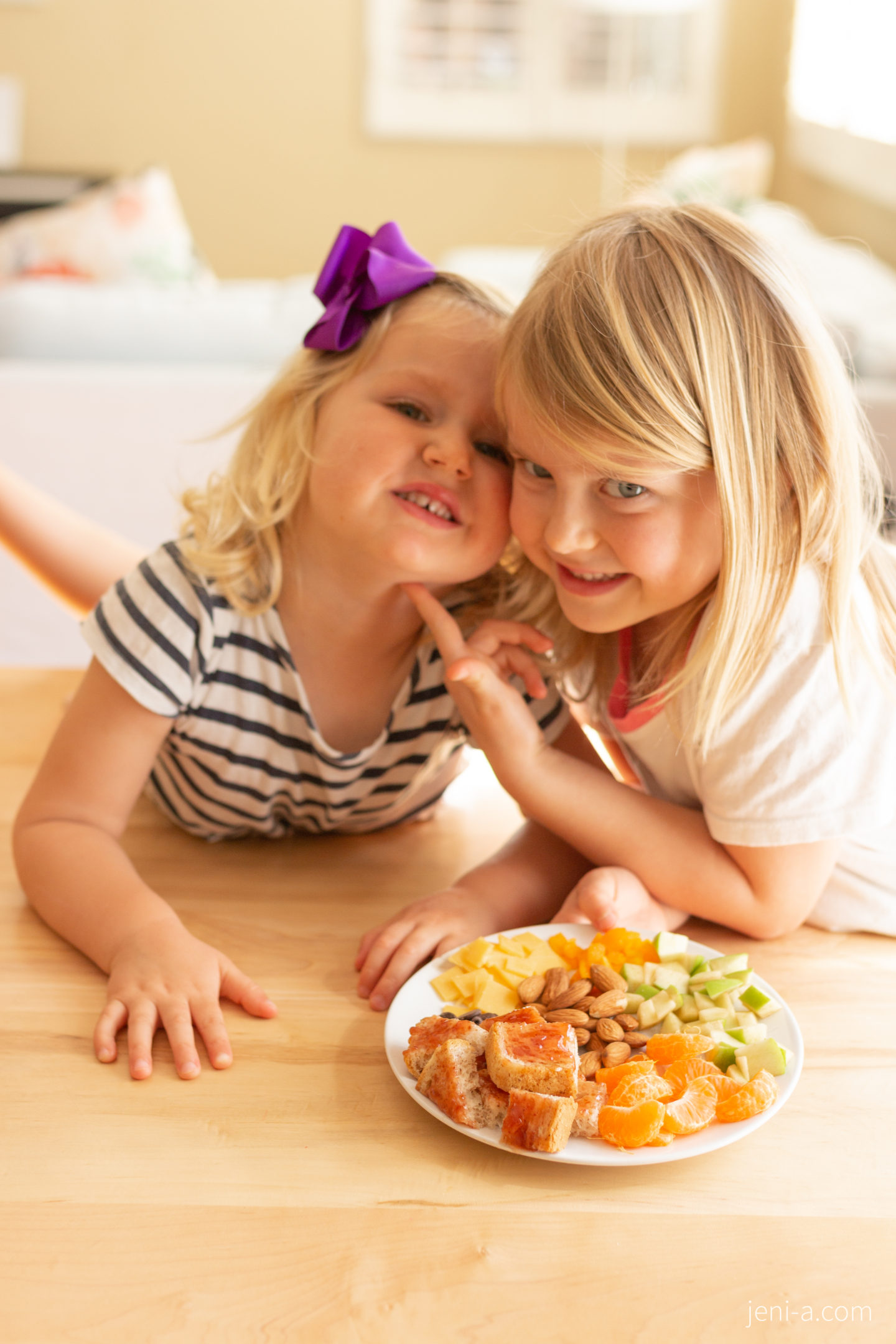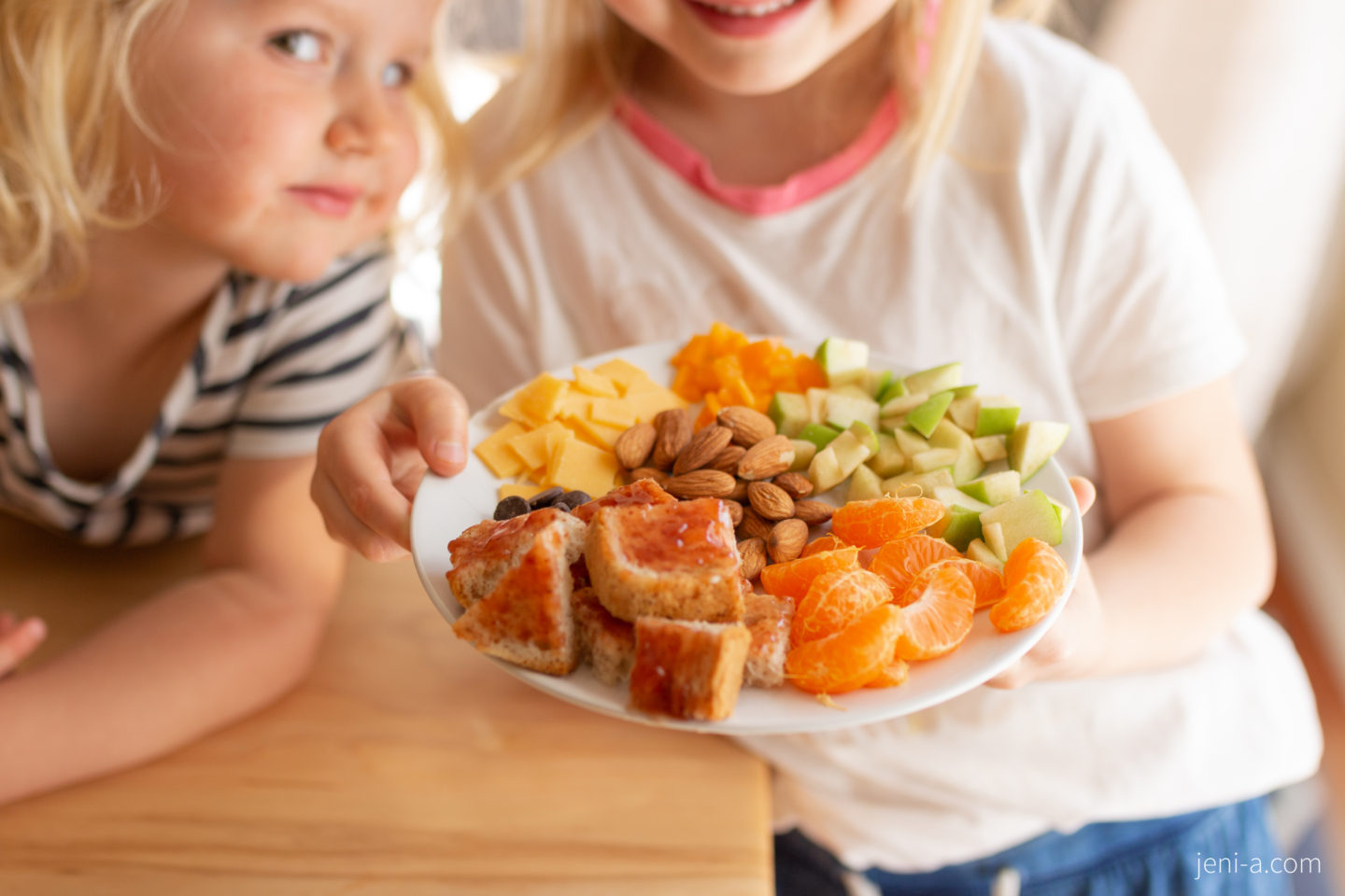 One of Claire and Emmy’s favorite things to do together after Chloe goes down for her nap is to prepare a picnic lunch, charcuterie plate style. 🙂 Claire has a knack for pulling beauty out of nowhere and magically mixing it in with whatever she’s doing, and her little lunches are no exception. Like I didn’t teach Claire how to pick a variety of finger foods and to cut up food into small pieces and to arrange them circularly on a plate. My guess is that she watched me work on a variation of a charcuterie board for our Freaky Feast at Halloween (I also made a small desert charcuterie board on Christmas Eve), but either way, Sis has the magic touch and Emmy is her perfect, most-obedient sous-chef.