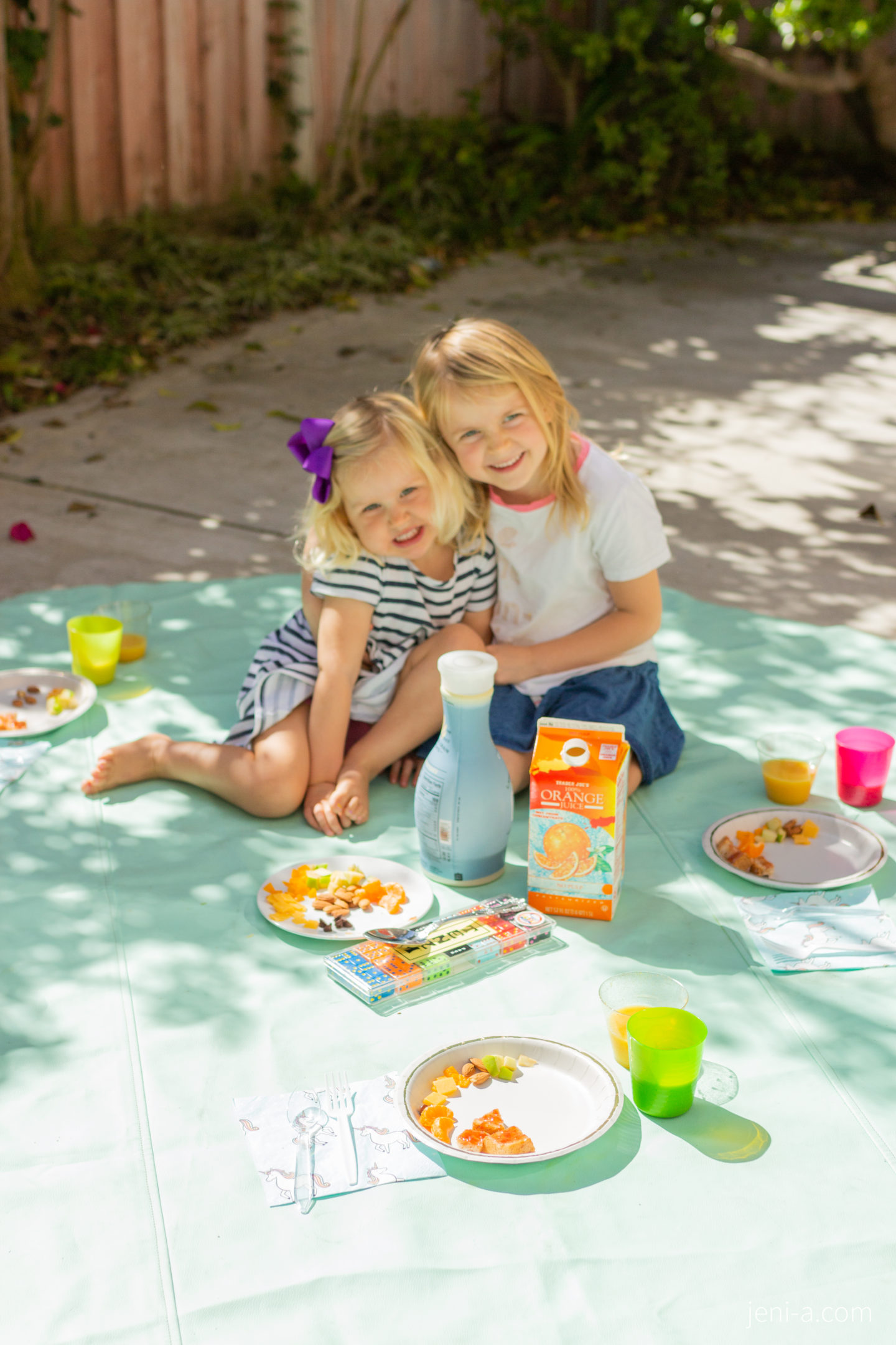 And lest you think the girls stop at creating such a work of art for lunch, oh no, they max out by pulling out the mat and taking lunch outside. Every day. Complete with drinks, napkins, and a game to play when we’re done eating. Their lunches are 100% one of my favorite things about their season together at home. MmmI love them so much.