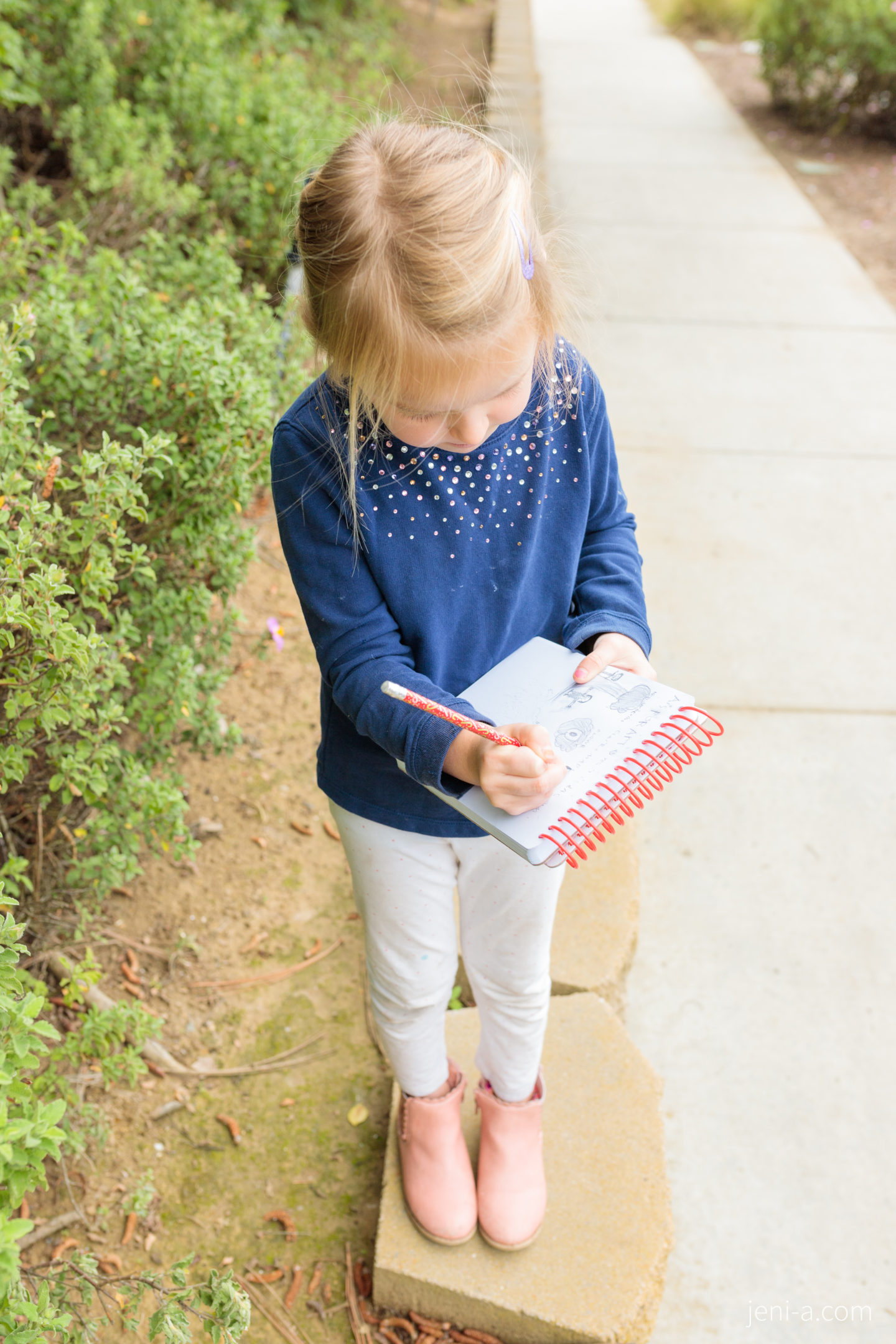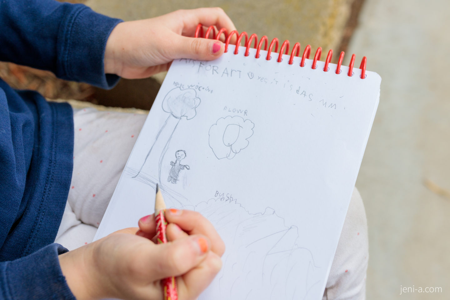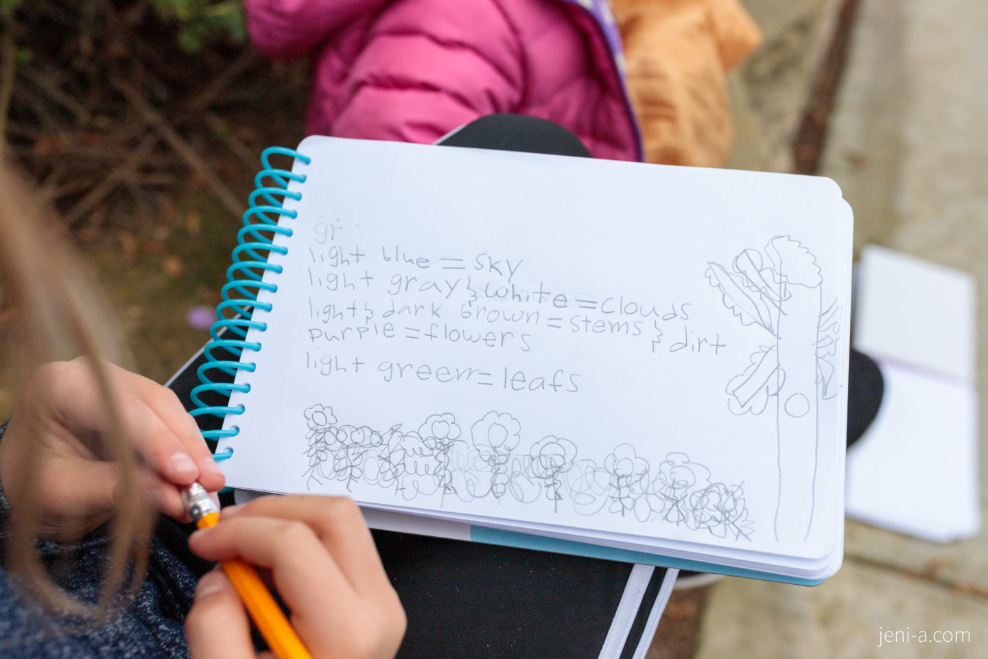 — Discuss their definitions/introduce “art plen air,” since you’re outside! Painting “plen air” means taking your studio outside, and it’s an age-old practice for artists. Artists often set up camp with their easel and tools right in the heart of their inspiration, so a forest or a lake’s side or in the mountains, and they create from there. And now, since you’ve been walking and talking, stop and sit and practice “art plen air” – use your pencil and paper and get to work at sketching something inspiring around you (you’ll take your sketch home and turn it into a painting next)! This was where we stopped to sketch…