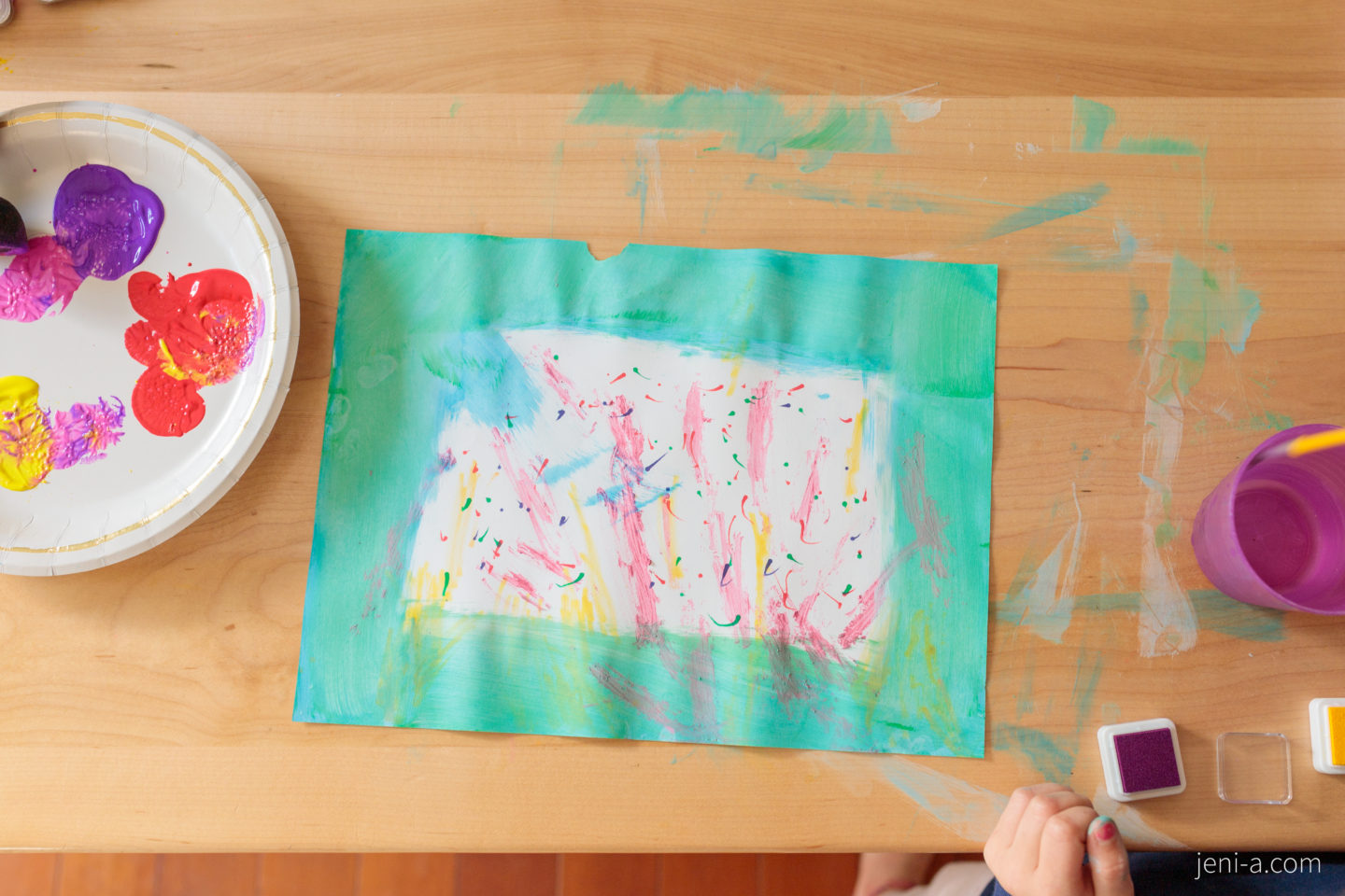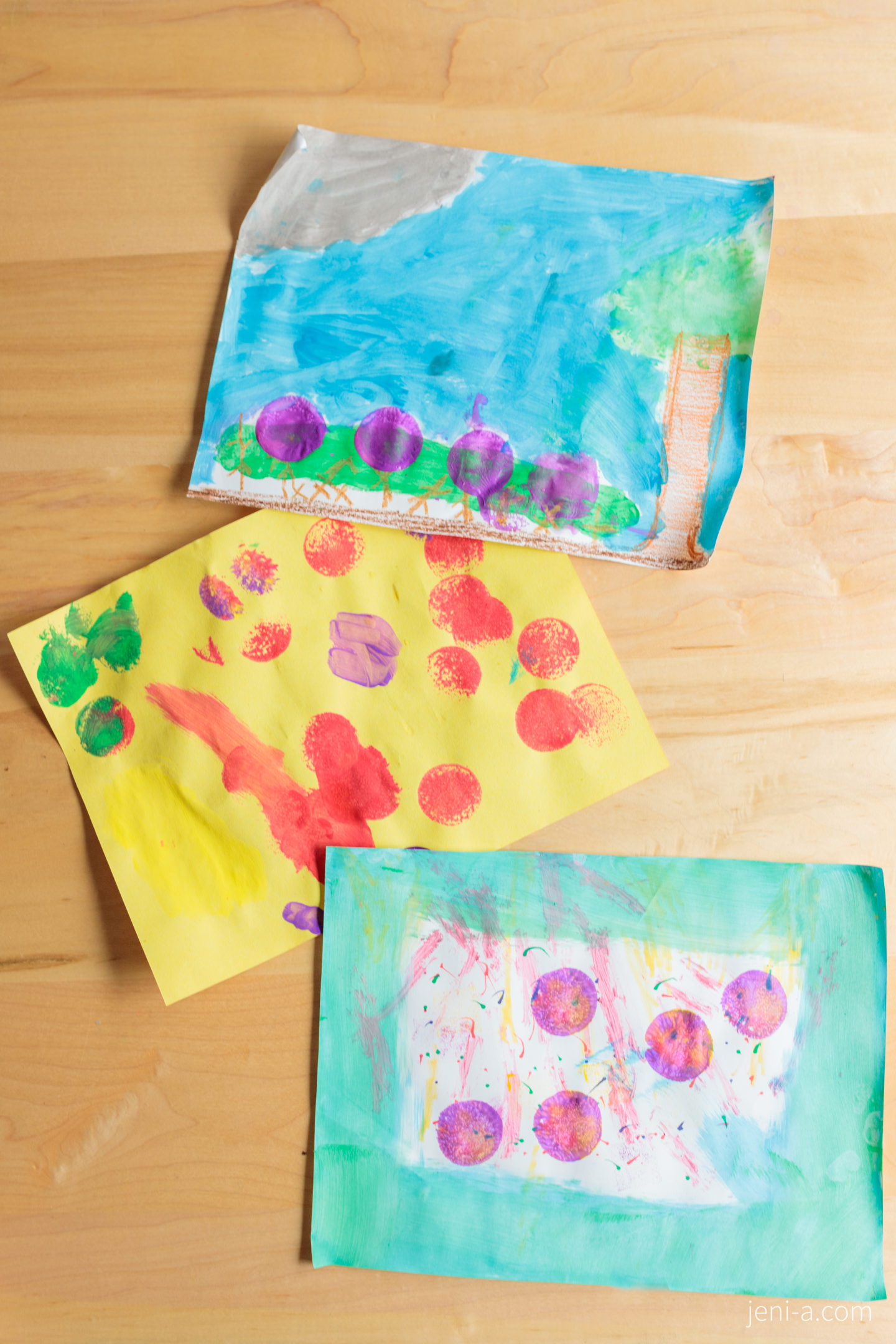 — Discuss art “mediums,” on that note! Teach that there are many mediums – or ways – to create and to be an artist. We made a list on my white board of different mediums: painting, sculpting, digital art (graphic design!), pencil art, etc. Then, pull out alllll the mediums you can for your kids and turn your plen air sketches into works of art! We used paint, markers, colored pencils, crayons and stamps…
