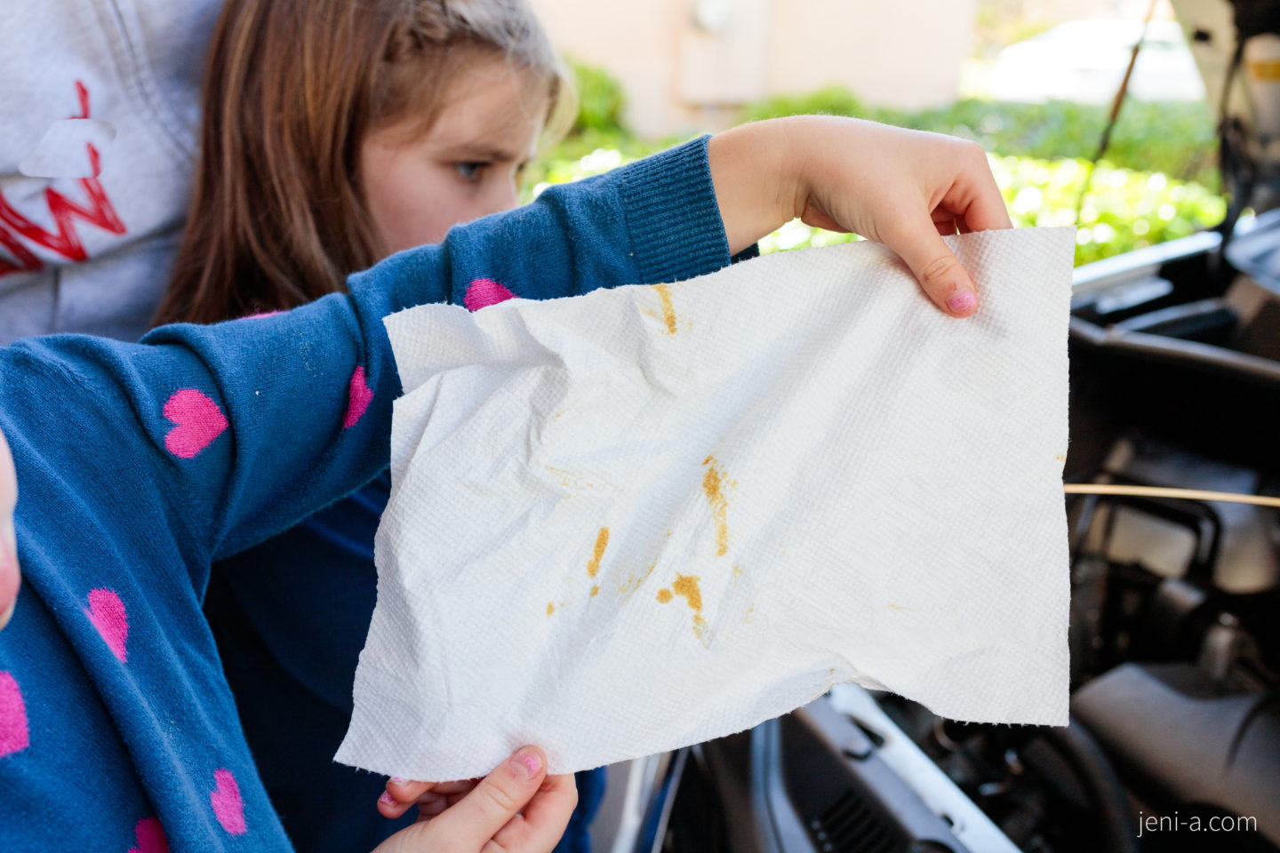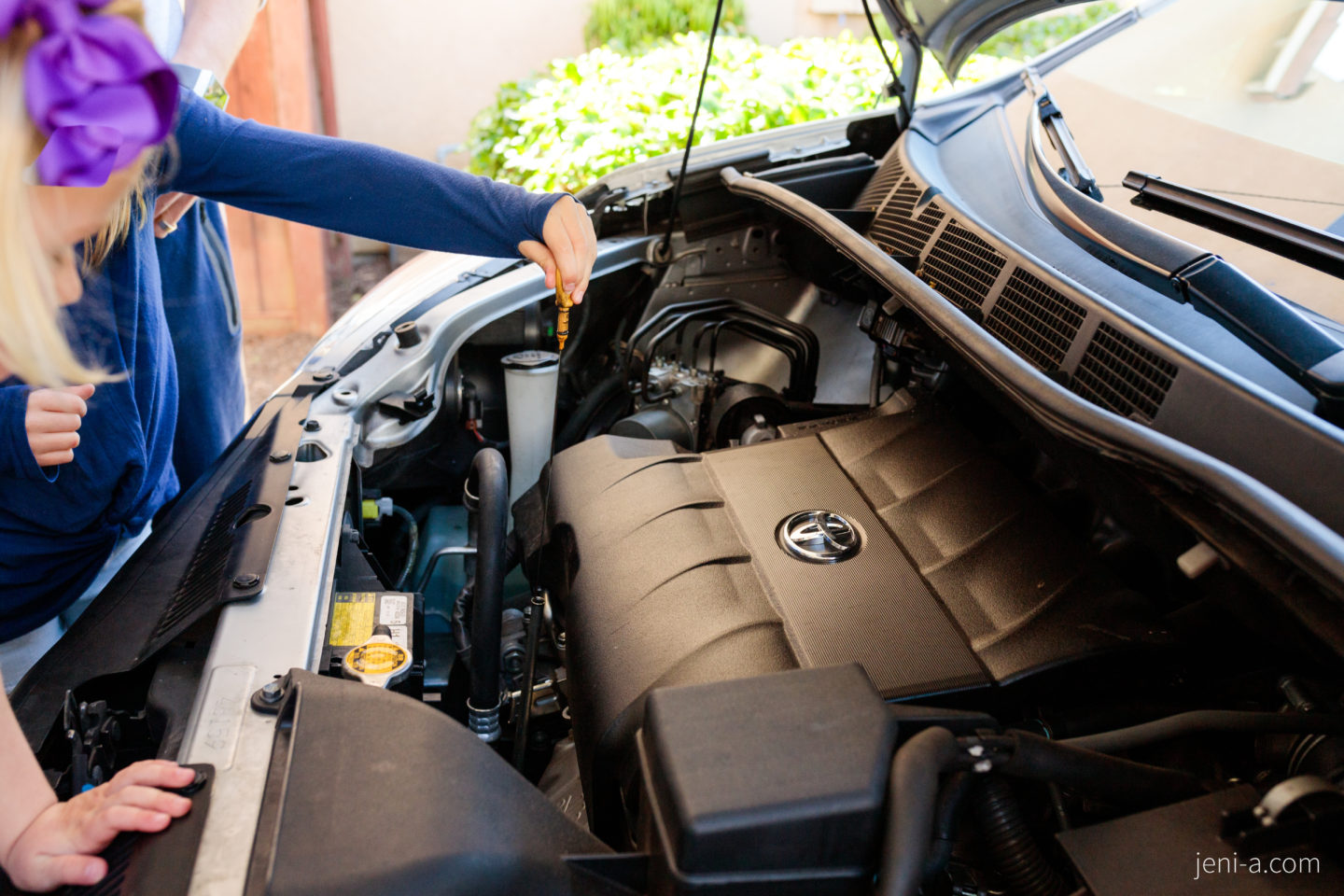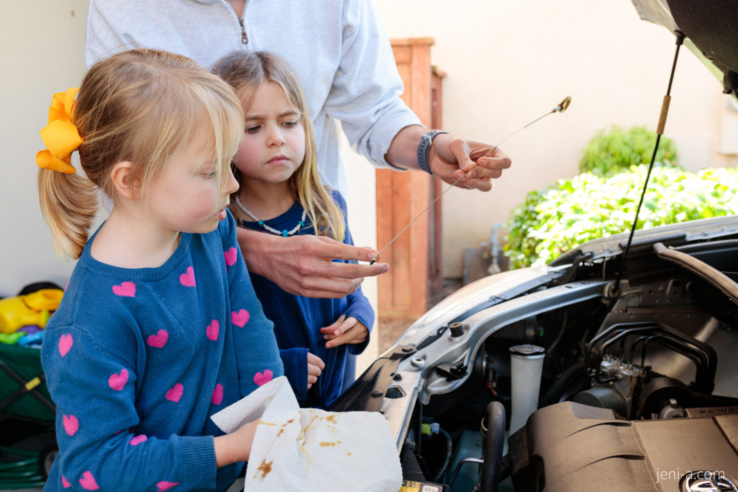 — Get under the hood! Okay, for this portion of class, I recommend inviting a special guest that knows about cars more than you do to come teach your kids what’s up under the hood. Unless you’re one of those bomb moms that knows car mechanics, of course (I know that you superstars are out there)! Ryan happened to be working from home last week (;) ), so he was our special, very informed guest. You can let your special guest take the reins, but our guest taught the girls where specific car parts are and what they do, such as the engine, the radiator, the dipstick, and the windshield wiper fluid, and then Ryan taught the girls how check the oil. It was awesome. Olivia’s grossed-out face is telling you otherwise in the pics below (she kills me, haha), but cha! Sis was into it. Cars just kind of messy, is all…
