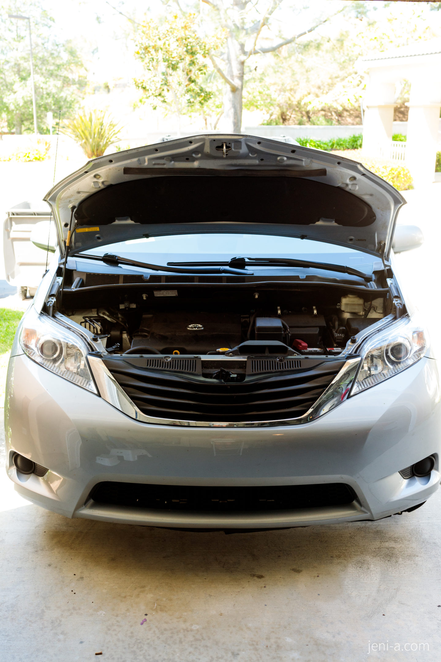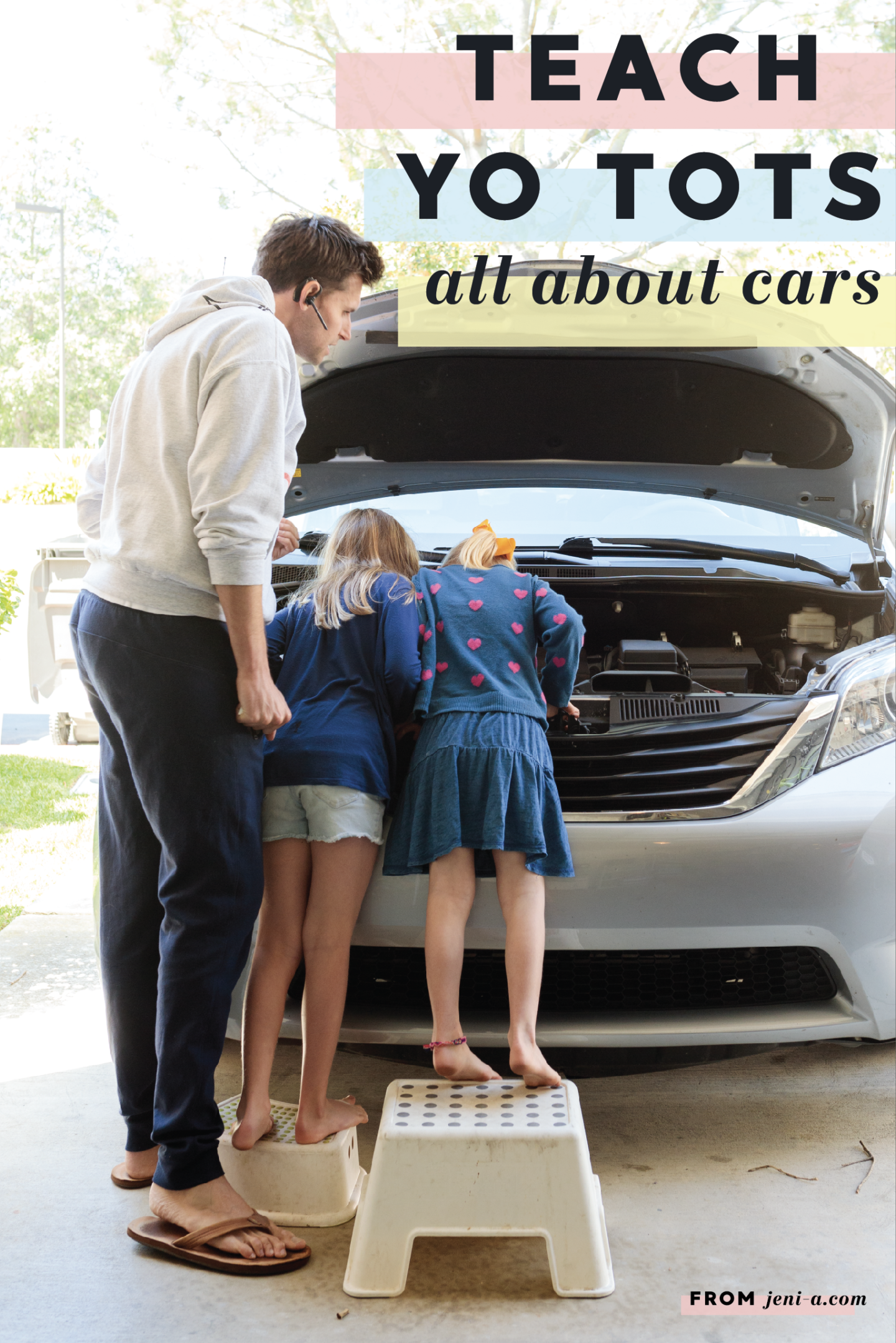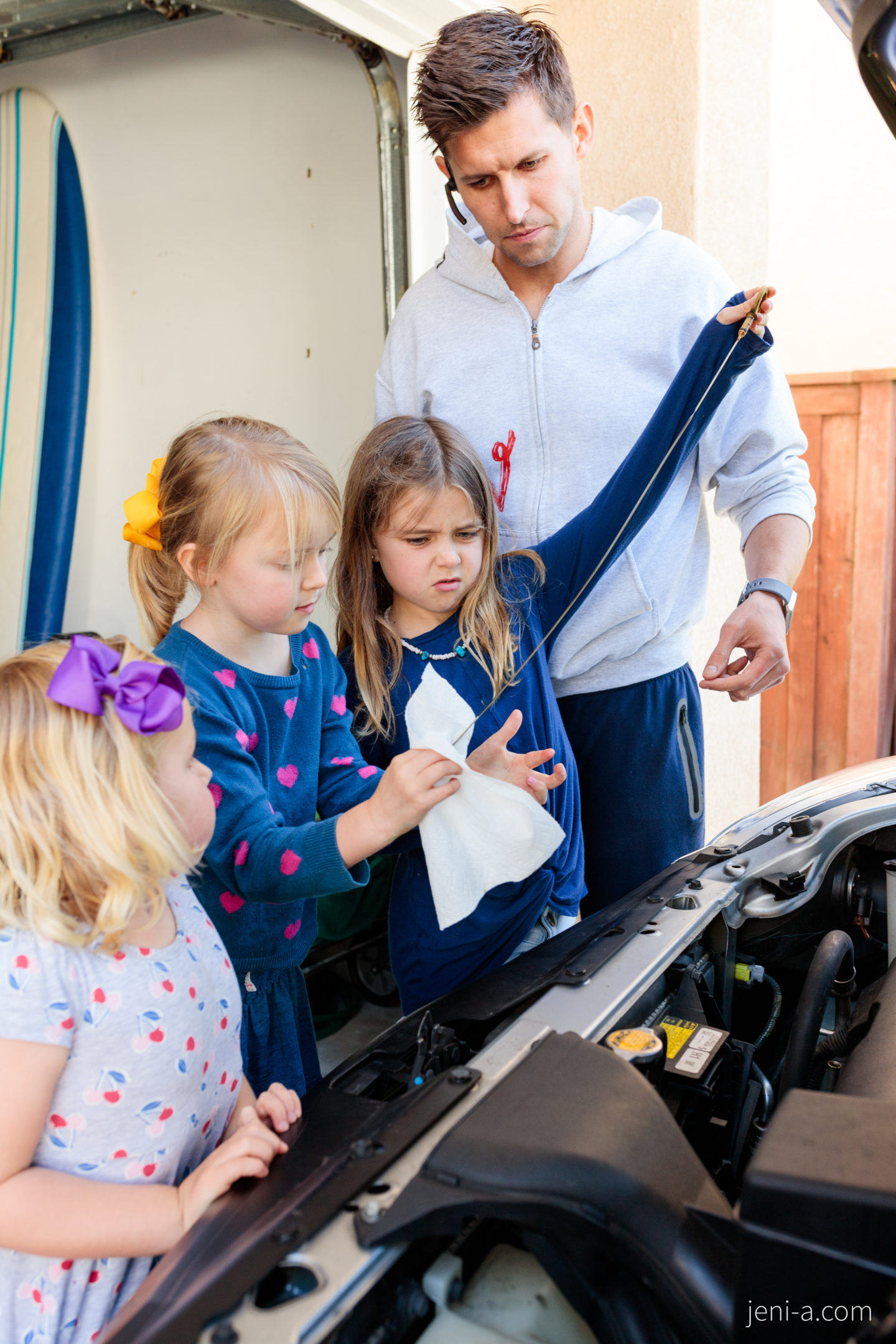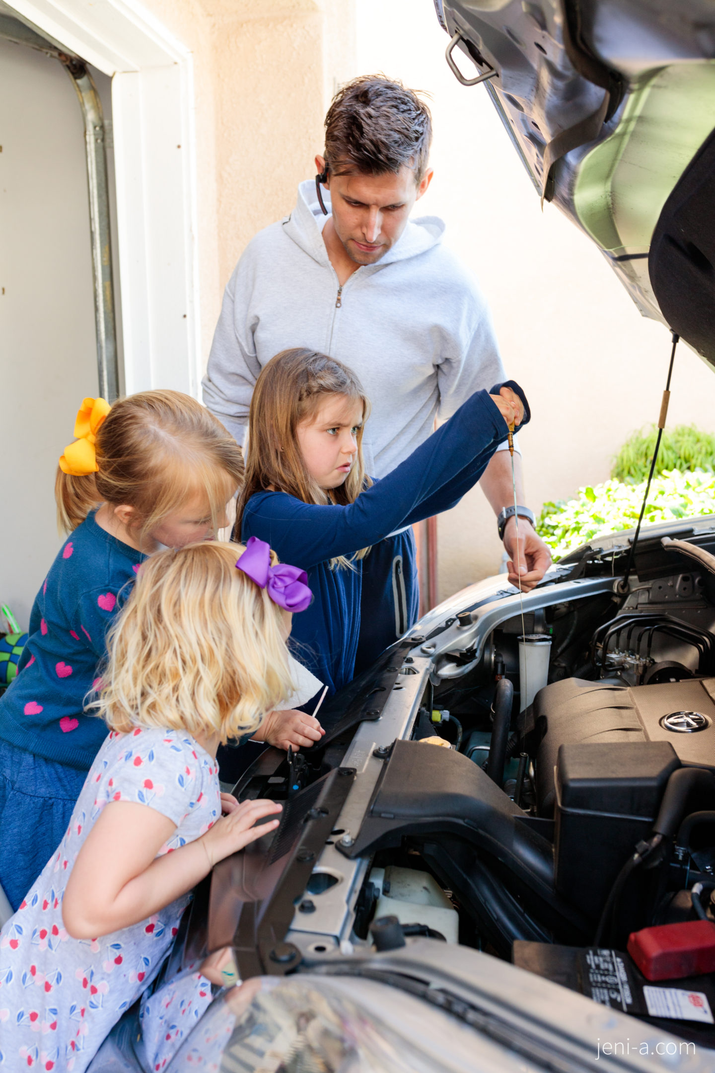 — Get under the hood! Okay, for this portion of class, I recommend inviting a special guest that knows about cars more than you do to come teach your kids what’s up under the hood. Unless you’re one of those bomb moms that knows car mechanics, of course (I know that you superstars are out there)! Ryan happened to be working from home last week (;) ), so he was our special, very informed guest. You can let your special guest take the reins, but our guest taught the girls where specific car parts are and what they do, such as the engine, the radiator, the dipstick, and the windshield wiper fluid, and then Ryan taught the girls how check the oil. It was awesome. Olivia’s grossed-out face is telling you otherwise in the pics below (she kills me, haha), but cha! Sis was into it. Cars just kind of messy, is all…