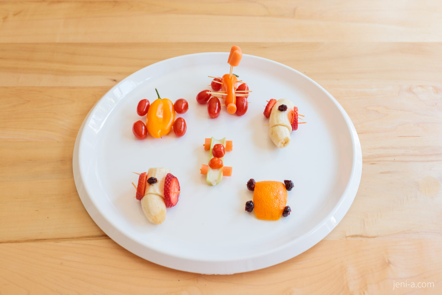 — Make model cars out of food! To top off the lesson, hit the kitchen and make your own cars out of whatever food you have on hand. We had a blast with this portion. The girls got to practice prepping food with a “big knife” (I was right there monitoring), and they got super creative…