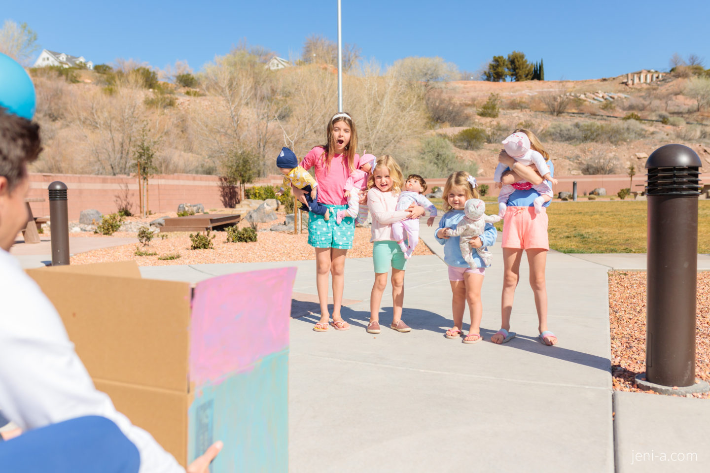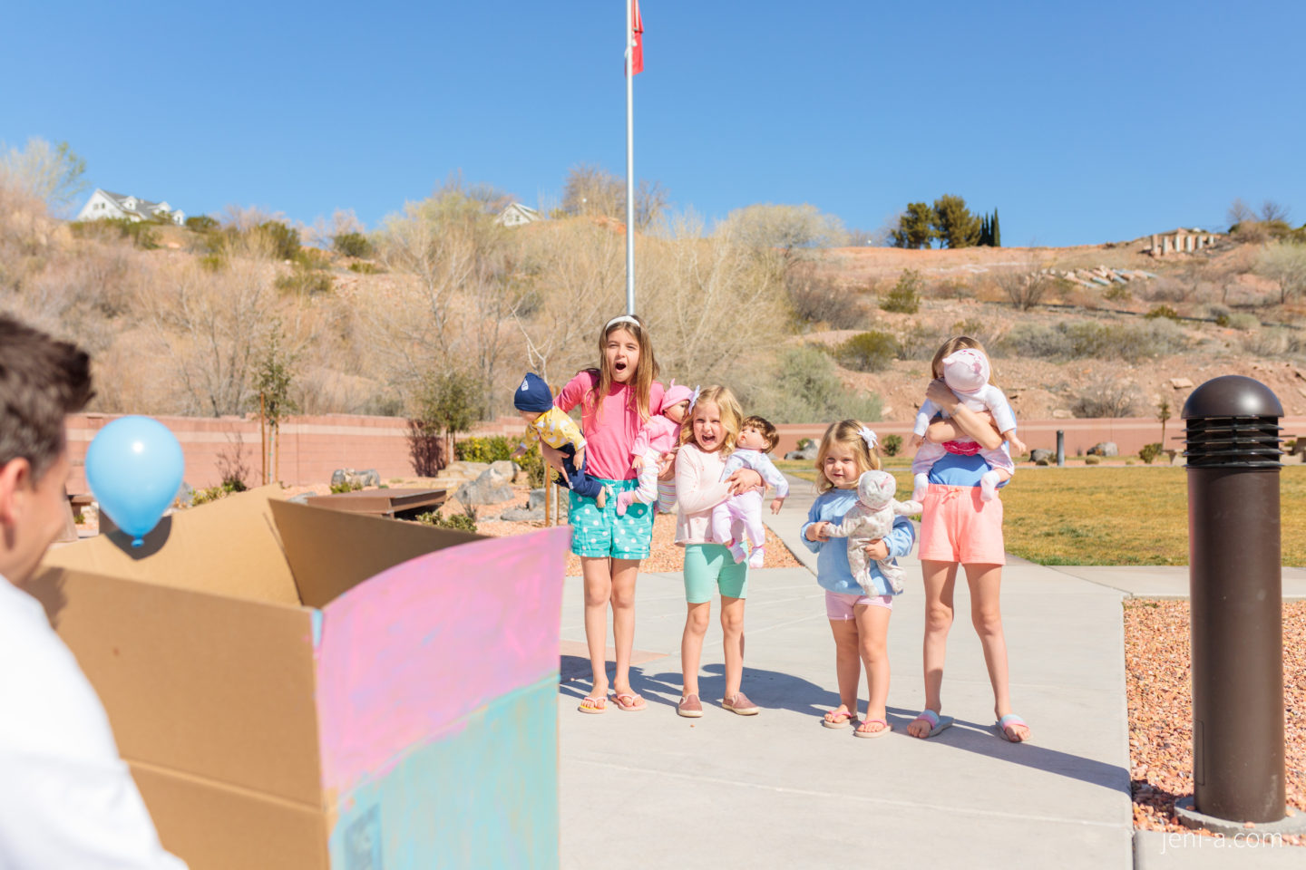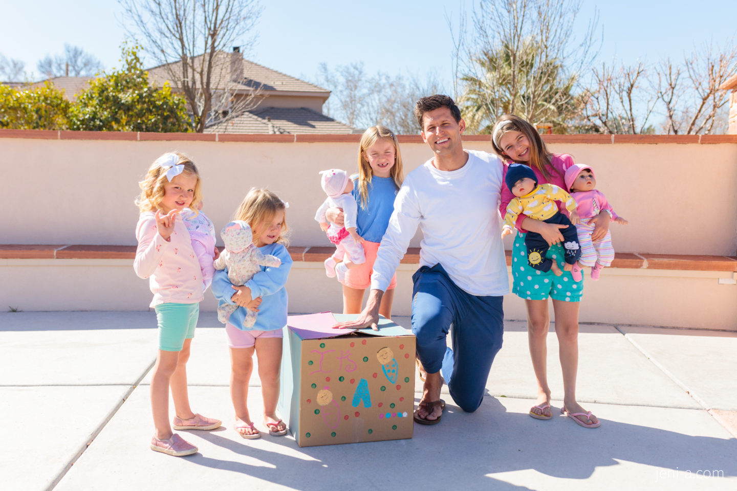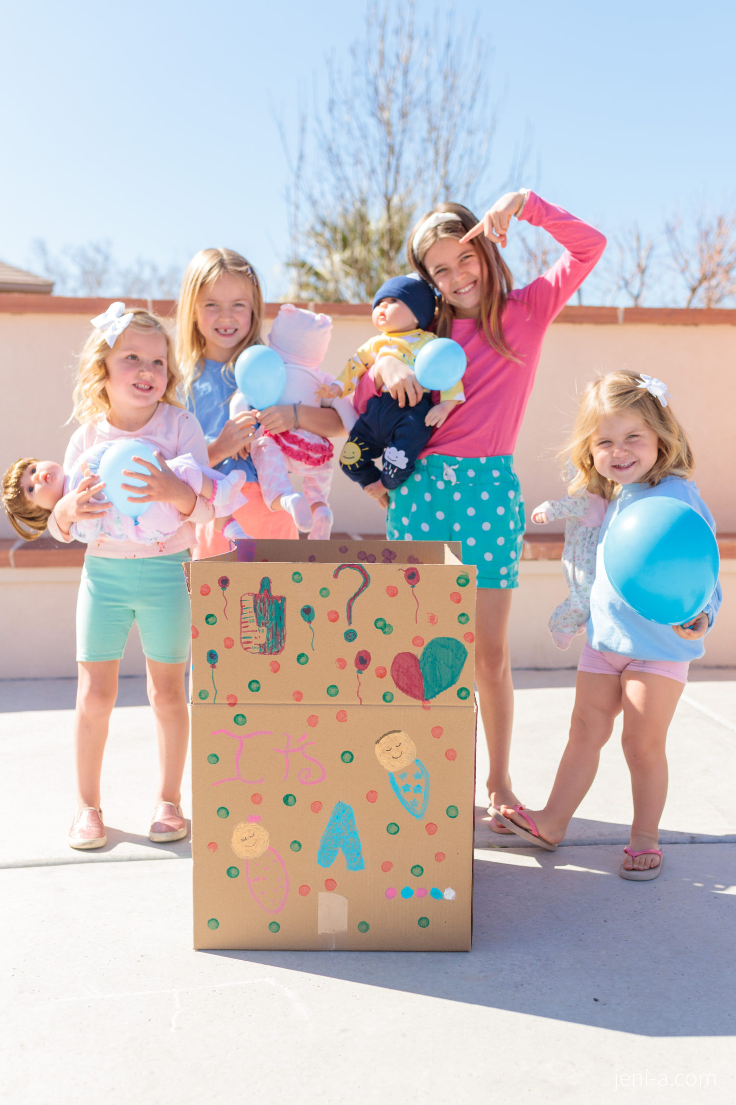 I was belly laughing at Ryan’s total shock, which made the ultra-sound wand and the baby wiggle all over the place, so I pulled it together as Ryan and the doctor started laughing, too. We rushed home to tell these cuties who grabbed their own “babies” for the little party, the cardboard box they decorated themselves, and all of their stoke to see whether pink or blue balloons were going to float up out of that box and into the sky.